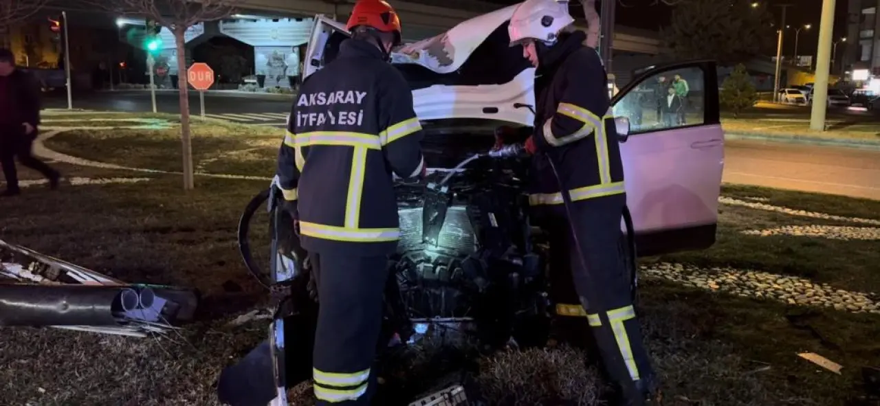 Aksaray'da kontrolden çıkarak aydınlatma direğine çarpan otomobilde yangın çıkarken, sürücü ise kazanın ardından aracını bırakarak kayıplara karıştı. Olay, Küçük Bölcek Mahallesi eski sanayi üst geçidi altında meydana geldi.