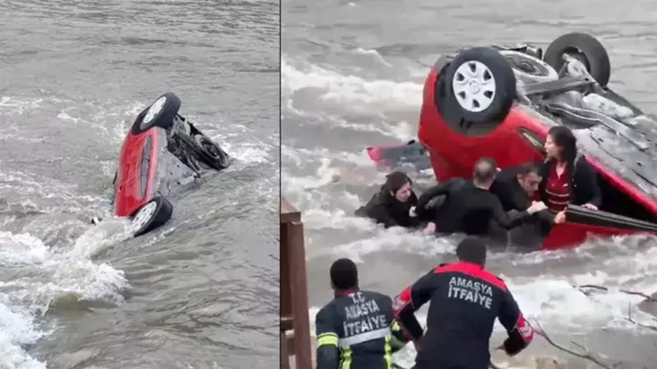 Çarpışmanın etkisiyle savrulan otomobil, köprünün demir korkuluklarını kırarak Yeşilırmak’a uçtu. Nehirde 50 metreden fazla sürüklenen araç ters döndü. Çevredekilerin ihbarı üzerine olay yerine Amasya Belediyesi İtfaiye Sualtı Kurtarma ekipleri, polis, AFAD ve sağlık ekipleri sevk edildi.