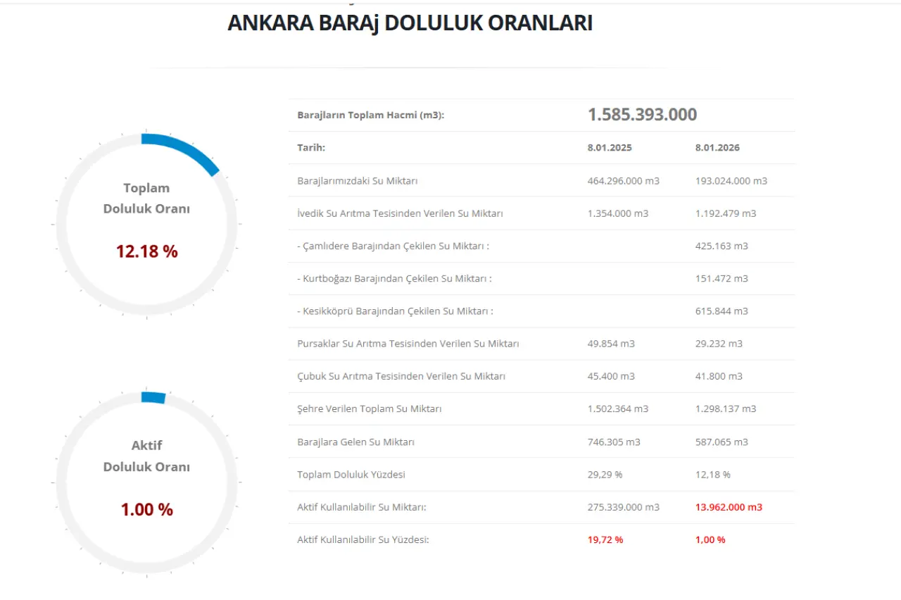 ASKİ'nin 8 Ocak 2026 raporuna göre, Ankara barajlarındaki toplam doluluk oranı yüzde 12,18 olarak ölçülürken, asıl tehlike aktif kullanılabilir su miktarında yaşanıyor. Geçen yılın aynı gününde 275 milyon metreküp olan aktif su miktarı, bu yıl sadece 13 milyon metreküpe geriledi. Bu tablo, bir yıl içinde kullanılabilir rezervlerin yüzde 95 oranında azaldığını gösteriyor.