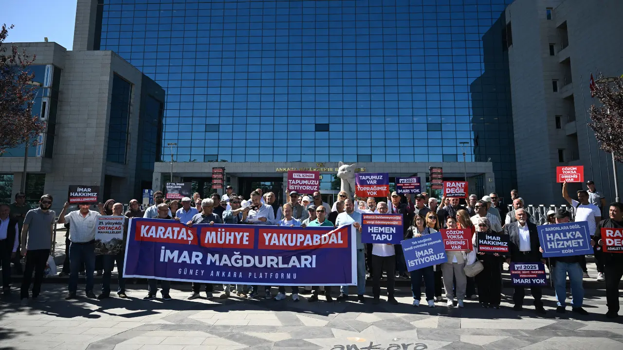 Çankaya ilçesine bağlı Karataş, Mühye ve Yakupabdal mahallelerinde ikamet edenlerden oluşan bir grup, imar sorunlarının çözümü talebiyle Ankara Büyükşehir Belediyesi (ABB) önünde eylem yaptı.