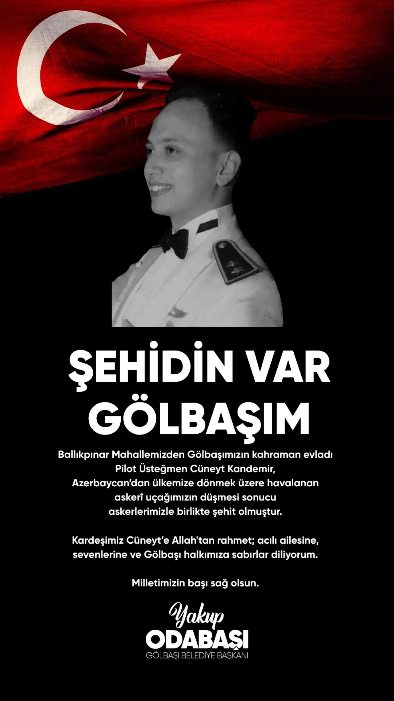 Gölbaşı Belediye Başkanı da sosyal medya üzerinden taziye mesajı yayımladı. Mesajında, “Ballıkpınar Mahallemizden, Gölbaşımızın kahraman evladı Pilot Üsteğmen Cüneyt Kandemir, Azerbaycan’dan ülkemize dönmek üzere havalanan askeri uçağımızın düşmesi sonucu silah arkadaşlarıyla birlikte şehit olmuştur. Kardeşimize Allah’tan rahmet, ailesine ve Gölbaşı halkımıza sabır diliyorum. Milletimizin başı sağ olsun.” ifadelerine yer verdi.