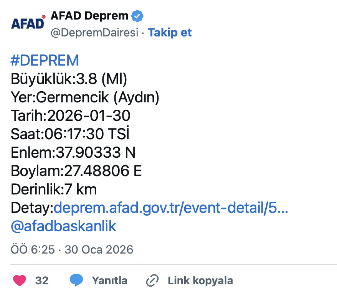 Aydın'da meydana gelen 3.8 büyüklüğündeki deprem paniğe neden olurken, AFAD sarsıntıyı sosyal medya hesapları üzerinden paylaştığı verilerle duyurdu. İlk belirlemelere göre depremde herhangi bir can veya mal kaybı yaşanmazken, ekiplerin bölgedeki saha tarama çalışmaları devam ediyor.