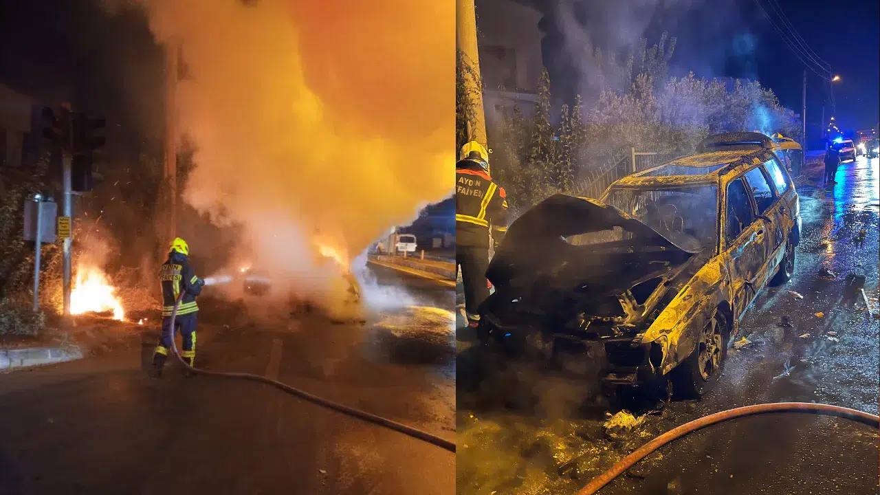 Aydın'ın Kuşadası ilçesinde otomobilde çıkan yangın itfaiye ekipleri tarafından söndürülürken, otomobil kullanılmaz hale geldi.