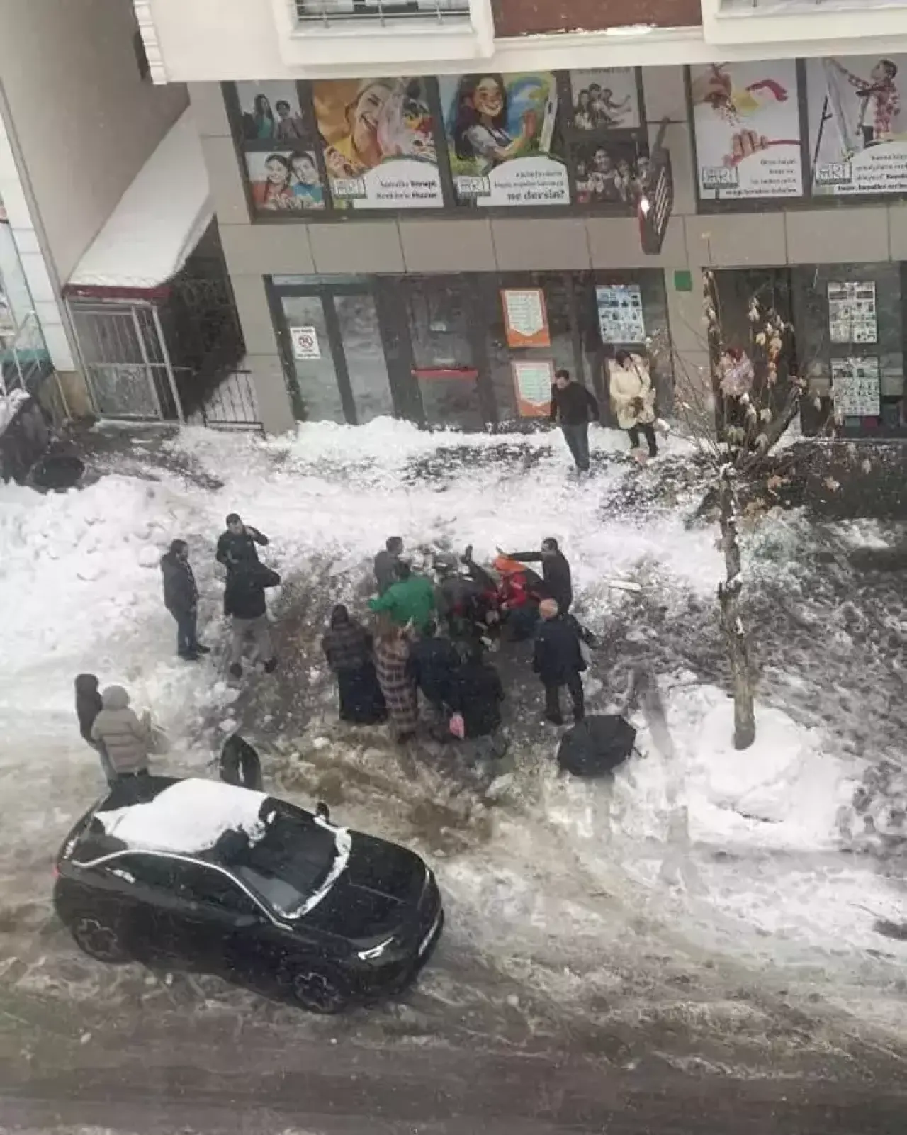 Caddedeki iş yerlerinin güvenlik kamerasınca kayıt altına alınan görüntülerde, bir binanın çatısından kütlenin yola ve bir aracın üzerine düştüğü görülüyor.