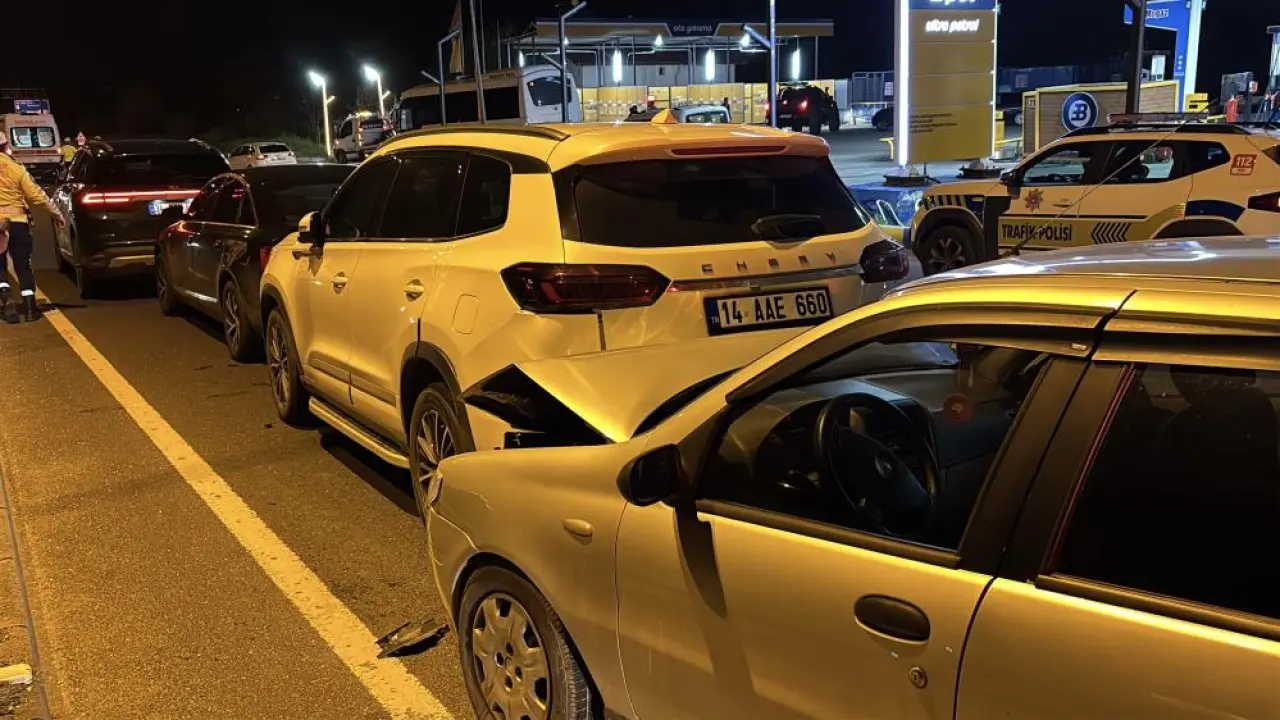 Bu sırada arkadan gelen 14 ADV 223 plakalı motosiklet, duramayarak araca çarptı ve yola savruldu. Motosiklet kazasını fark edip aynı istikamette seyreden cipin sürücüsü de kazaya karışmamak için ani fren yaptı. Cipin aniden durması üzerine arkasından gelen 3 araç peş peşe birbirine girdi. Toplam 4 aracın karıştığı zincirleme trafik kazası ve motosikletin çarpması sonucu meydana gelen olayda 3 kişi yaralandı.