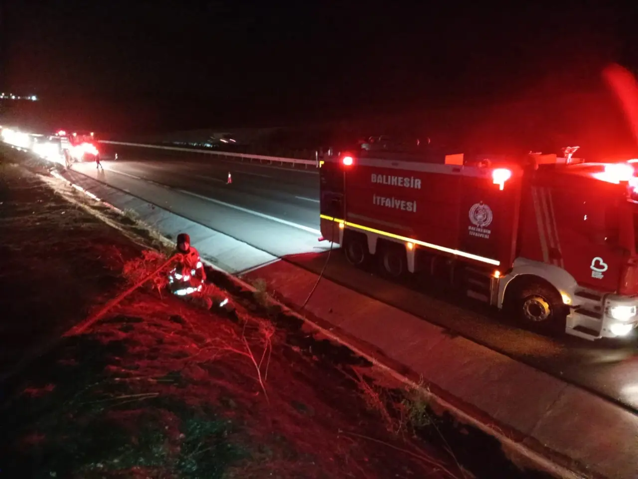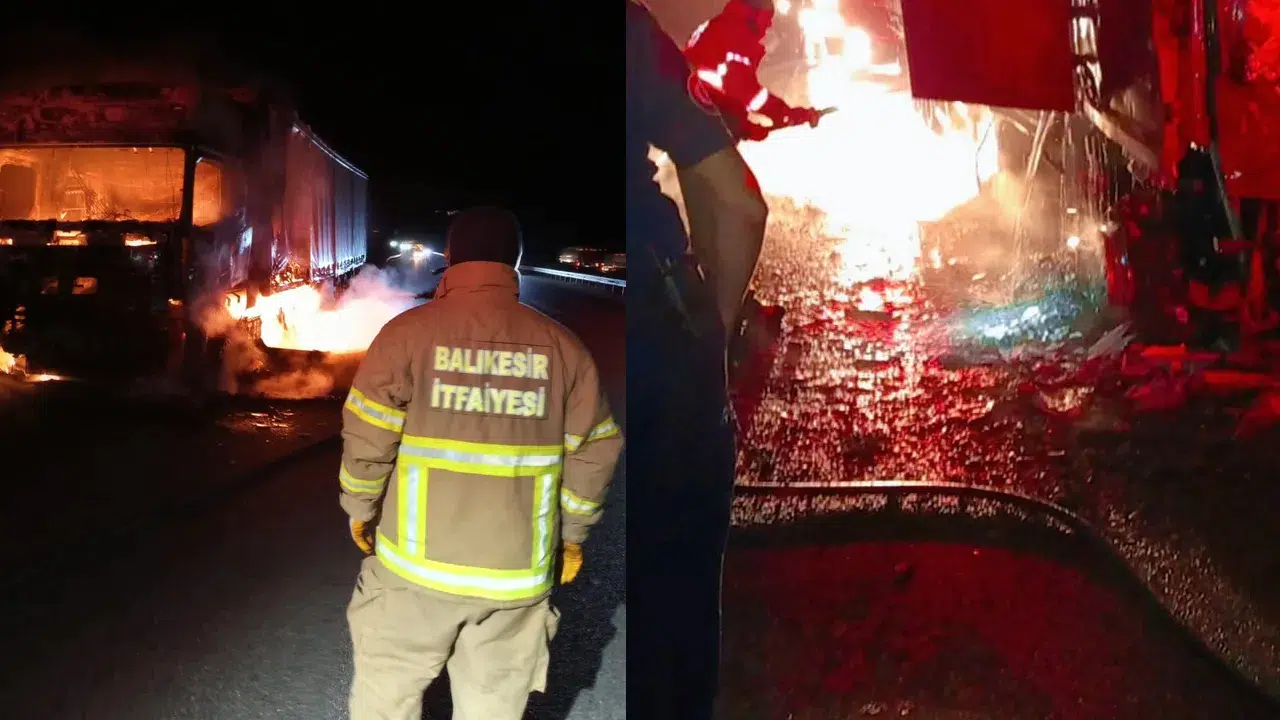 Balıkesir'den geçen İstanbul-İzmir otoyolunda meydana gelen yangınında tır kullanılamaz hale gelirken, yanan tır otoyol kenarında bulunan otluk alanda yangına sebep oldu.
