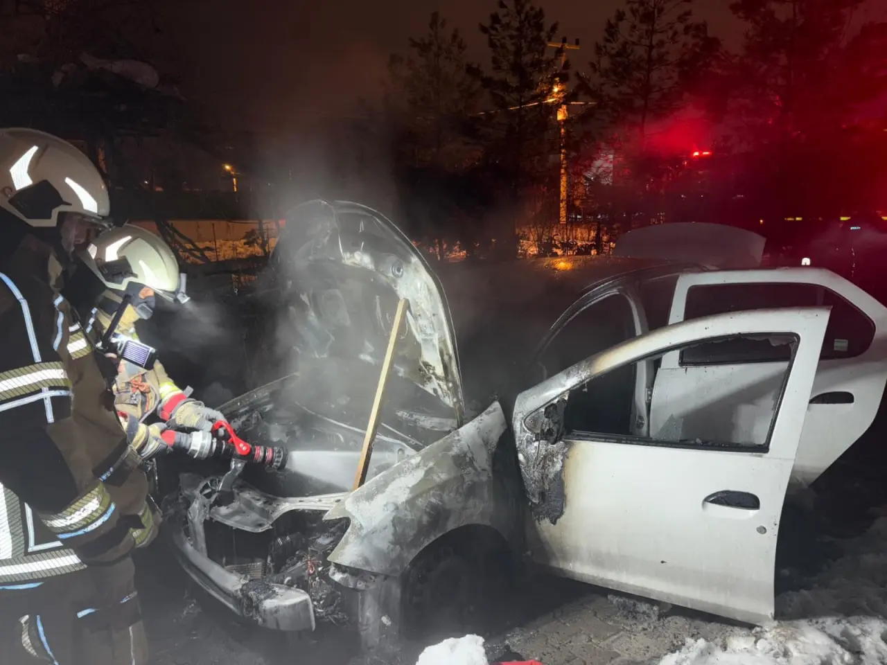 Olay yerine ulaşan itfaiye ekipleri, alev alev yanan otomobile müdahale etti. Yangın, ekiplerin yoğun çalışmasıyla çevreye sıçramadan kontrol altına alınarak söndürüldü. Soğutma çalışmalarının ardından aracın demir yığınına döndüğü görüldü. Polis ekipleri olay yerinde güvenlik önlemi alırken, yangının çıkış nedeninin belirlenmesi için geniş çaplı inceleme başlatıldı.
