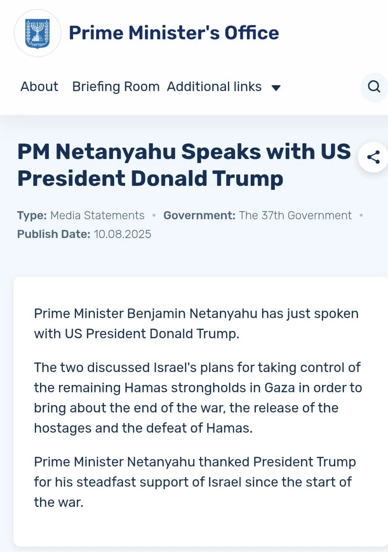 İsrail Başbakanı Binyamin Netanyahu, ABD Başkanı Donald Trump ile yaptığı telefon görüşmesinde İsrail’in Gazze’yi işgal planını ele alarak, İsrail'e verdiği kararlı destekten dolayı Trump'a teşekkür etti.