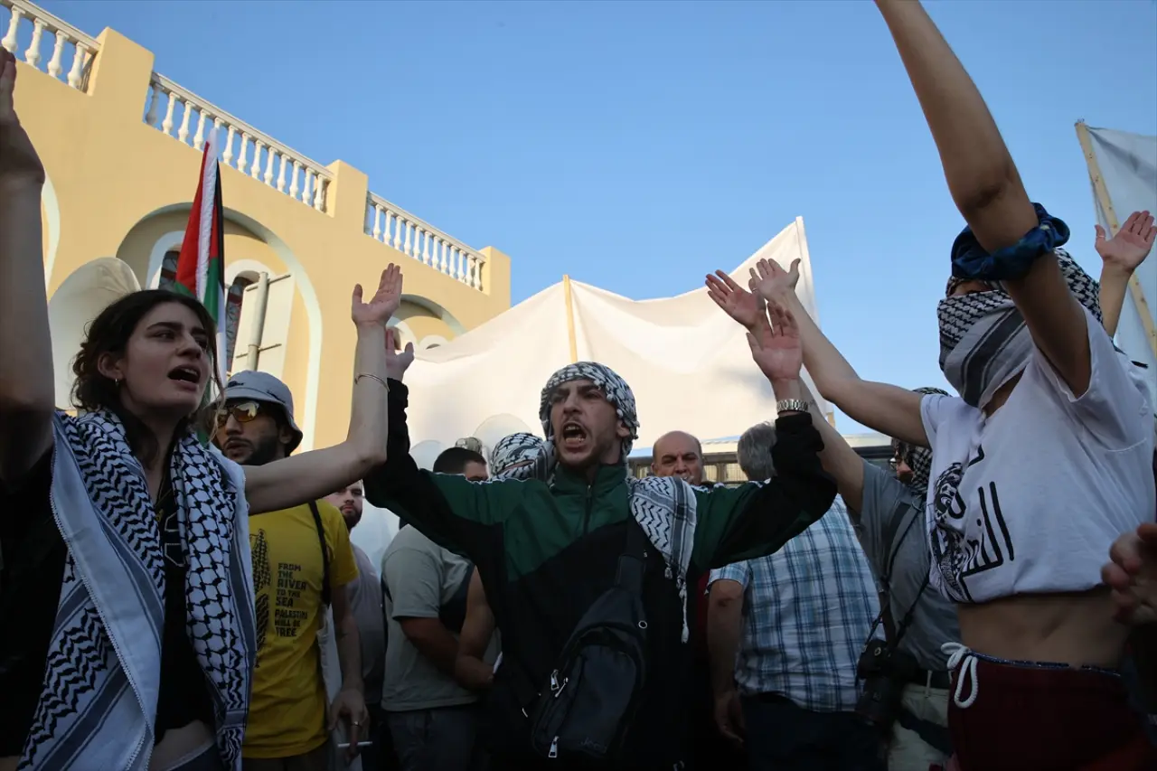 Yunanistan Komünist Partisi (KKE), çeşitli sol gruplar, sendikalar ile Filistin destekçisi aktivistlerden oluşan grup, İsrail'e ait gemideki yolcuların karaya çıkmasını engellemek amacıyla Pire Limanı'nda bir araya geldi.