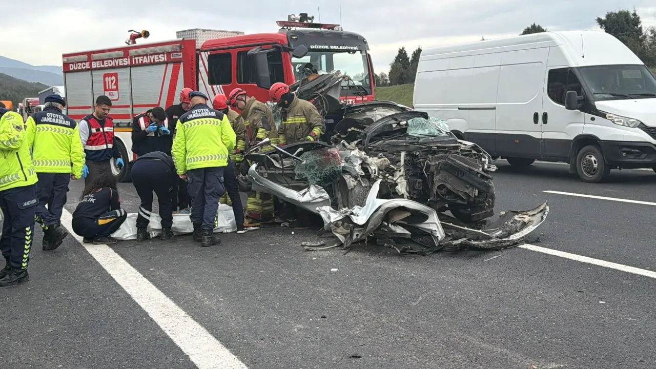 Kaza, saat 14.30 sıralarında Otoyolun Gümüşova rampaları mevkisinde meydana geldi. İstanbul istikametinde seyreden Hamza Güven (25) idaresindeki 34 BZN 727 plakalı otomobil, aynı yönde ilerleyen Hayati Erdoğan yönetimindeki 34 AZD 564 plakalı tıra çarptı. Çarpmanın etkisiyle sürücü Güven ile araçta bulunan Muhammed Furkan Bozar (20) otomobilde sıkıştı.