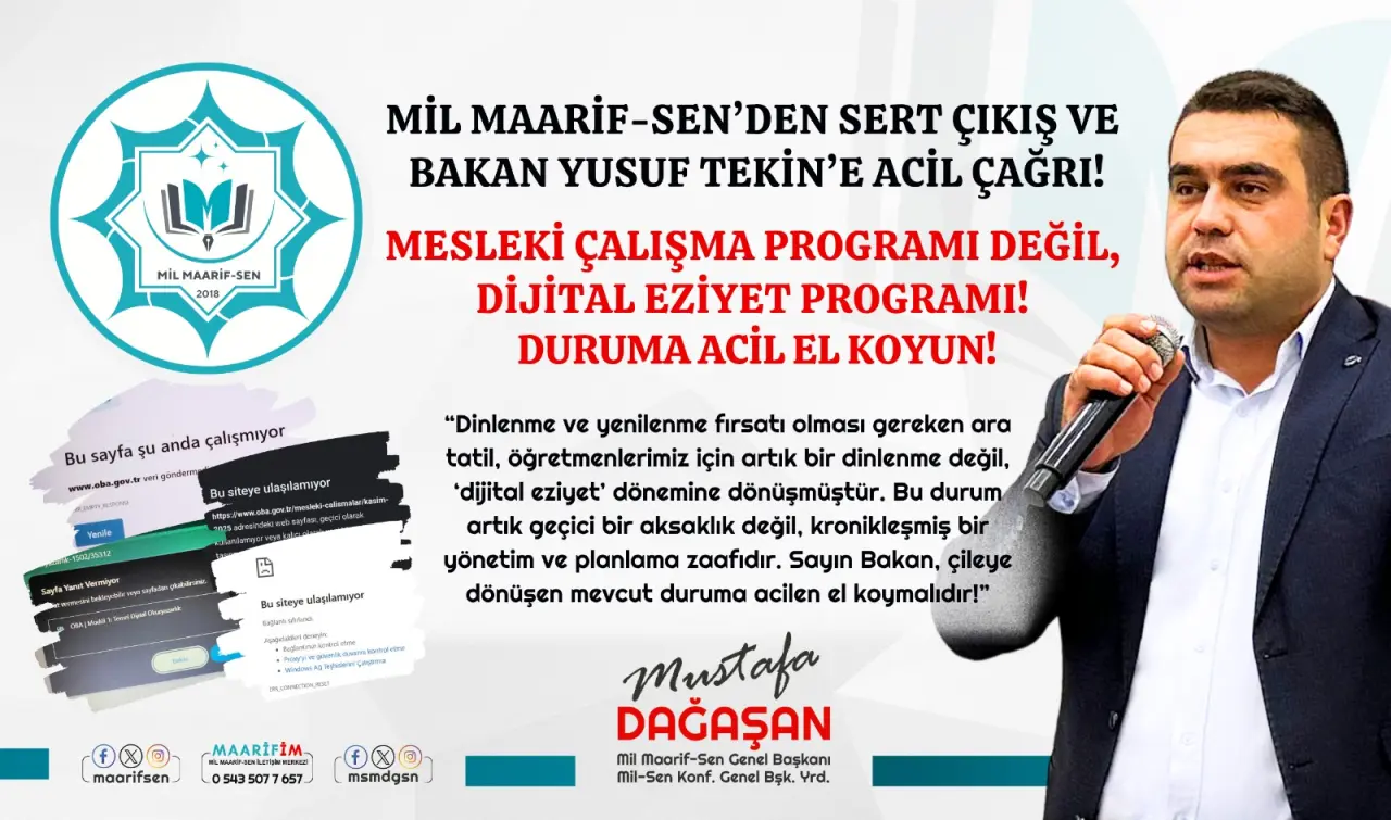 Mil Maarif-Sen Genel Başkanı Mustafa Dağaşan sosyal medya hesabından yapmış olduğu açıklamada, Kasım Dönemi Mesleki Çalışma Programı’nda (ÖBA) yaşanan çöküş nedeniyle Milli Eğitim Bakanı Yusuf Tekin’e acil müdahale çağrısında bulunarak, “Dinlenme ve yenilenme fırsatı olması gereken ara tatil, öğretmenlerimiz için artık bir dinlenme değil, ‘dijital eziyet’ dönemine dönüşmüştür. Bu durum artık geçici bir aksaklık değil, kronikleşmiş bir yönetim ve planlama zaafıdır. Sayın Bakan, çileye dönüşen mevcut duruma acilen el koymalıdır!” dedi.