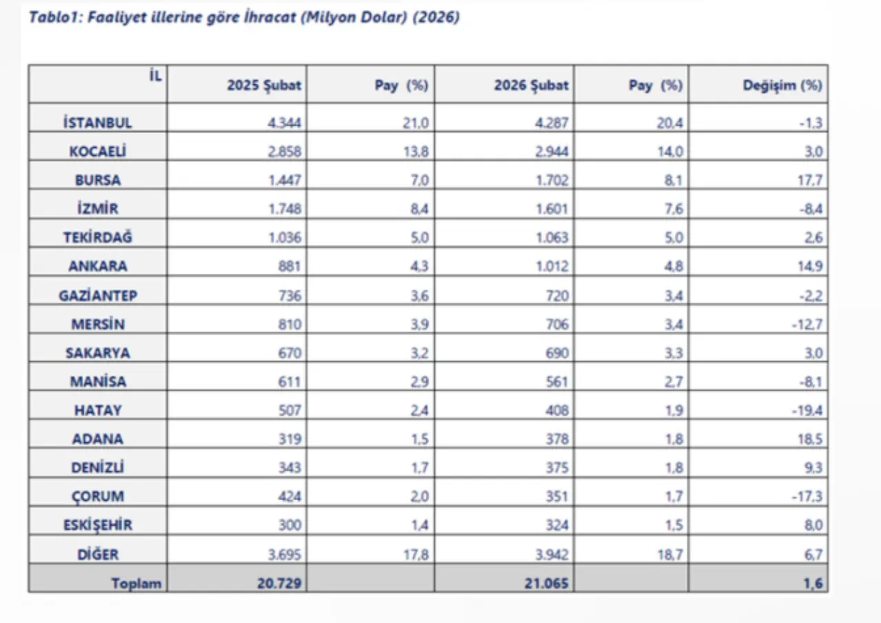 2026 yılı Şubat ayında geçen yılın aynı ayına göre ihracatta en fazla artış yaşanan iller de açıklandı. Buna göre: