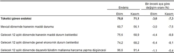 Türkiye İstatistik Kurumu ve Türkiye Cumhuriyet Merkez Bankası arasında yapılan işbirliği ile tüketici eğilim anketi sonuçlarından hesaplanan mevsim etkilerinden arındırılmış tüketici güven endeksi, Kasım ayında bir önceki aya göre %7,3 oranında azaldı; Ekim ayında 76,8 olan endeks, Kasım ayında 71,1 oldu.