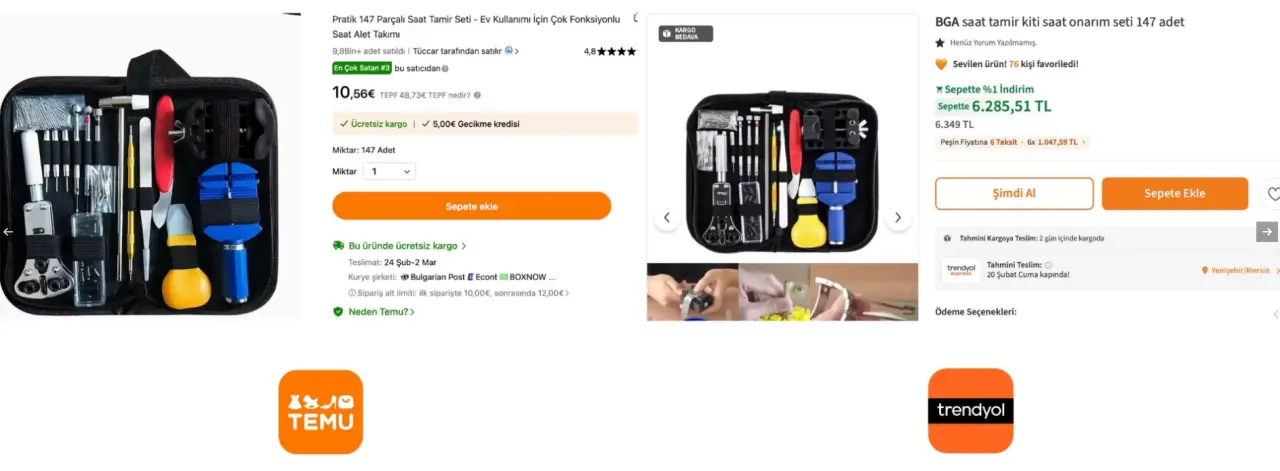 - 147 parçalık saat tamir kiti yurt dışında 484 TL’ye satılırken, yerli platformda 6.285 TL’ye listelendi.