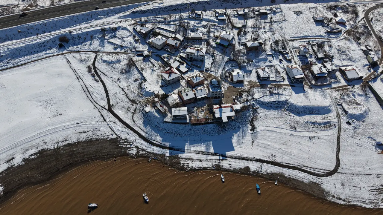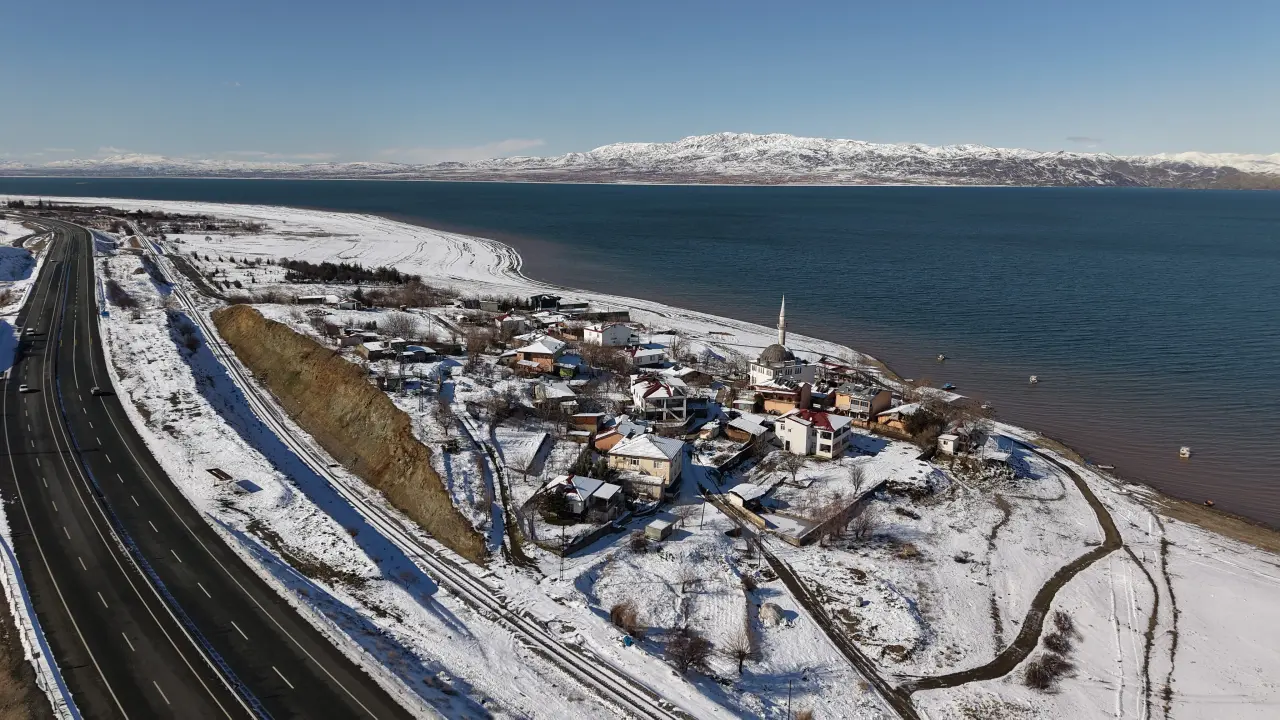 Elazığ'da Keban Baraj Gölü havzasında yer alan Aşağı İçme köyü, baraj suyu ve kar görüntüsüyle ortaya eşsiz manzaralar sundu.