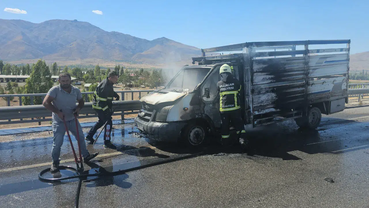 Erzincan'da seyir halindeyken alev alan kamyonet, itfaiye ekiplerin müdahalesiyle söndürüldü.