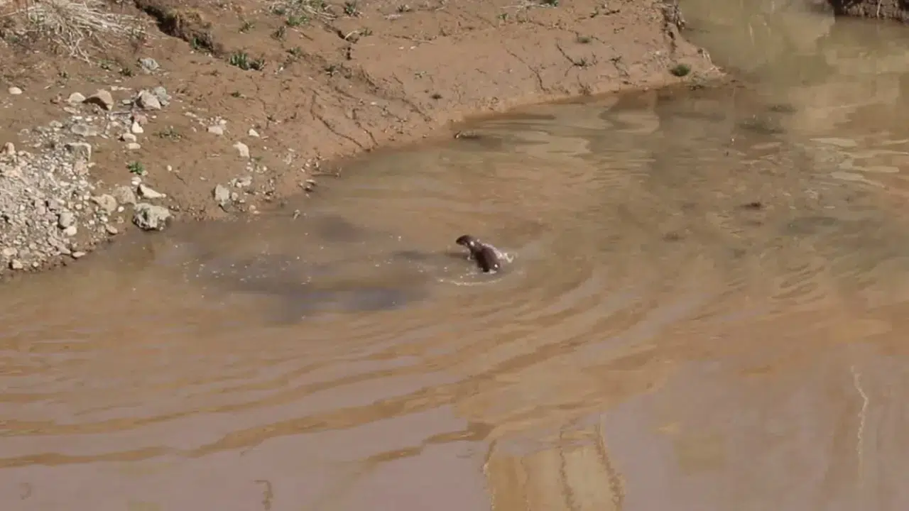 Köyde bahçe temizliği yapan Yıldırım Çalışkan, Oltu Çayı'nda sabah saatlerinde balık avlayan su samurunu fark etti.