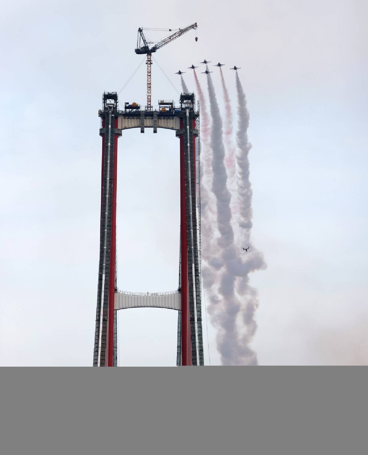 "Firmalarımız Güney Koreli iş ortaklarıyla birlikte kolları sıvadı, 5 binin üzerinde personelin, 740 iş makinasının geceli gündüzlü çalışmasıyla köprümüzü söz verdiğimiz tarih olan bugünkü açılışa hazır hale getirdi. Dünyada böylesine devasa bir eseri bu kadar kısa sürede tamamlayacak bir başka ülke var mıdır bilmiyorum. Türkiye orta açıklığı itibarıyla dünyanın en uzun köprüsüne sahip Japonya'yı geride bırakarak bu alanda ilk sıraya yerleşti. Tabii orta açıklık uzunluğu bakımından dünyadaki ilk 10 köprünün 3'ünün ülkemizde olduğunu da hatırlatmak isterim. Marmara'yı otoyollarıyla, köprüleriyle, tünelleriyle çepeçevre kuşatan otoyol projemizin bugün açılışını yapacağımız kısmı 2,5 milyar avroluk yatırım bedeline sahiptir. Peki bu 2,5 milyar avroluk yatırım bize ne kazandıracaktır? Ülkemizin bu yatırımla sadece zamandan, akaryakıt tüketiminden ve karbon salınımı azalımından kazancı yıllık ne kadar olacak biliyor musunuz? 415 milyon avro. Şehirlerimiz arasında güvenli, konforlu, hızlı şekilde yapılacak seyahatin kolaylığına, rahatlığına, huzuruna değer biçilir m? Yapılan hesaplamalar bu projenin ekonomimize üretimde 5,3 milyar avro, istihdama 118 bin kişi, milli gelirde 2,4 milyar avro ilave katkısının olacağına işaret ediyor. Velhasıl neresinden bakarsanız bakın ülkemiz için kazanç, milletimiz için iftihar kaynağı bir eserin açılışını yapıyoruz."