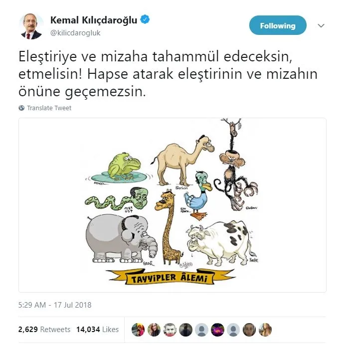 Kemal Kılıçdaroğlu, daha önceki bir paylaşımında Cumhurbaşkanı Recep Tayyip Erdoğan'ı kastederek "Tayyipler Alemi" görseli ile "Eleştiriye ve mizaha tahammül edeceksin, etmelisin." ifadelerini kullanarak paylaşım yapmıştı.