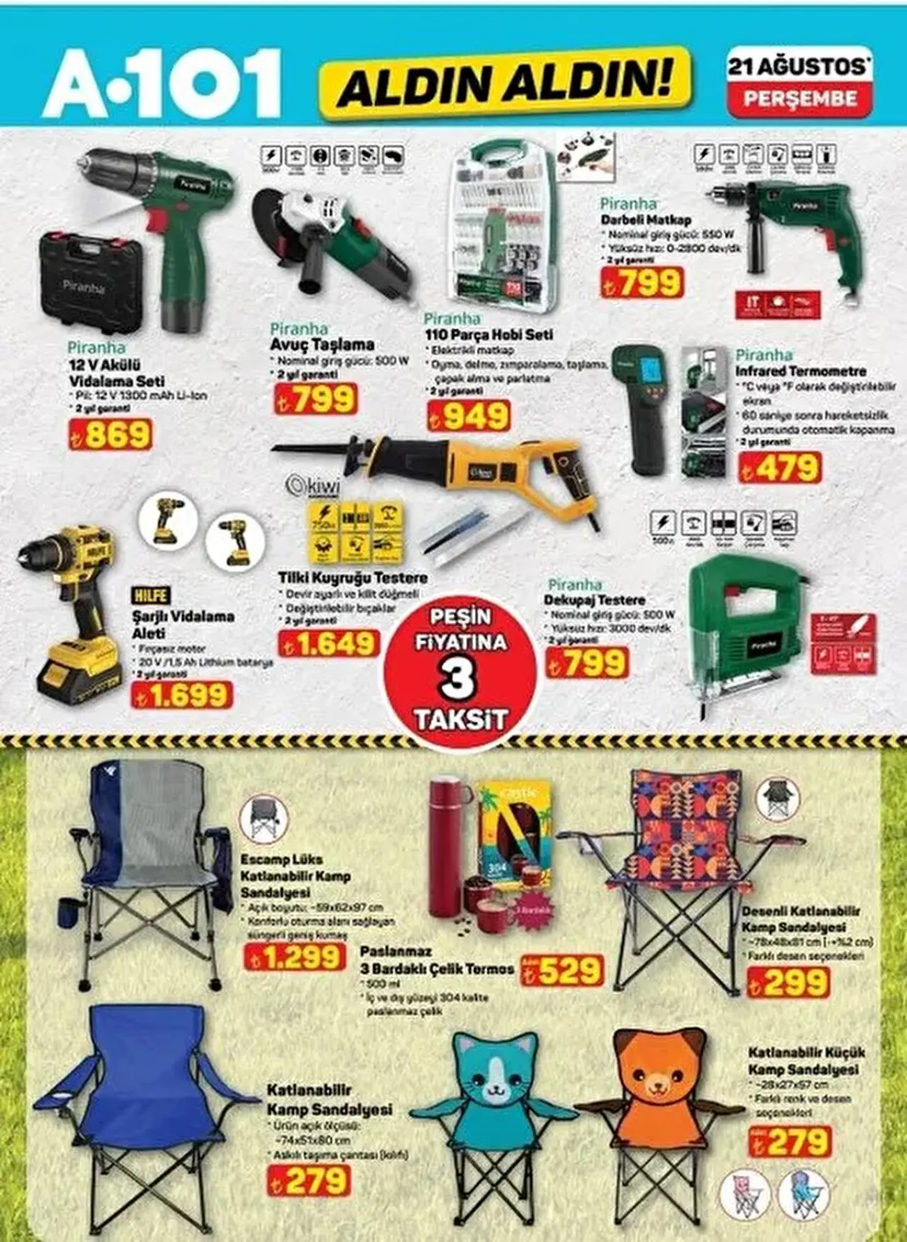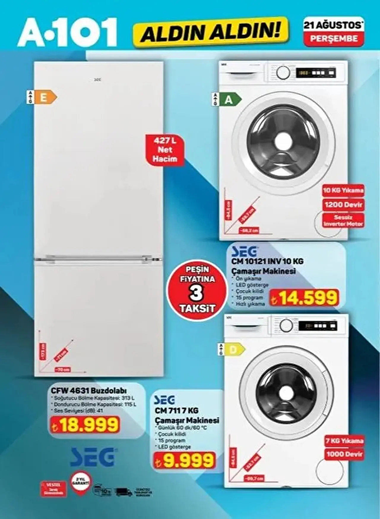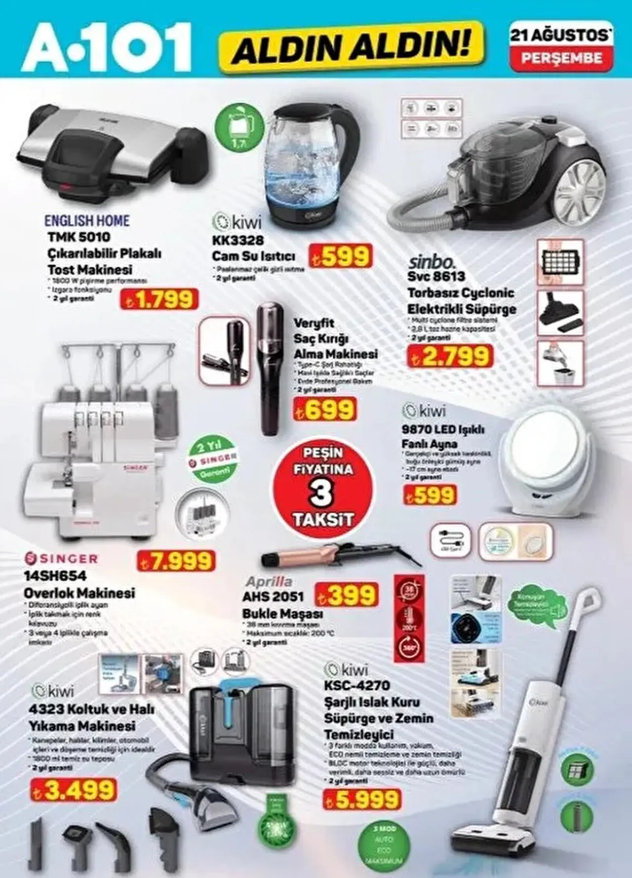 A101, 21 Ağustos 2025 tarihinden itibaren geçerli olacak yeni aktüel ürünler kataloğunu duyurdu. Bu haftadan itibaren raflarda yerini alan kampanyalı ürünler; teknolojiden beyaz eşyaya, kırtasiye malzemelerinden küçük ev aletlerine kadar geniş bir ürün yelpazesini kapsıyor. Ürünler, sınırlı süreli avantajlı fiyatlarla tüketiciyle buluşuyor.