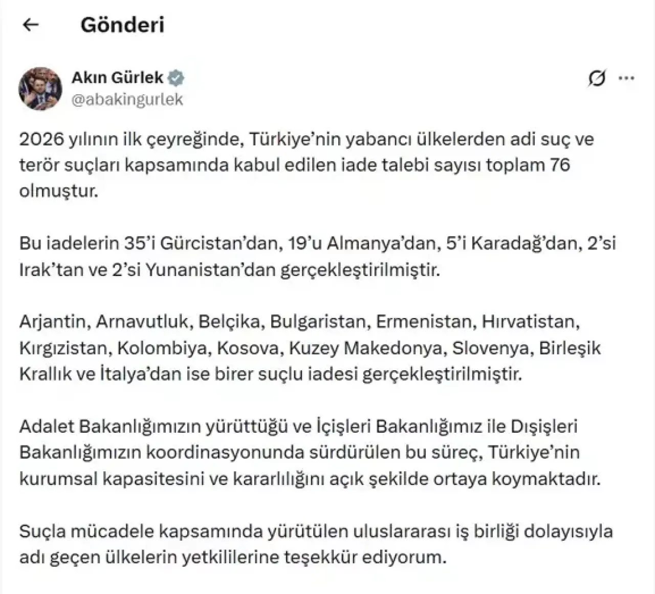 "2026 yılının ilk çeyreğinde, Türkiye'nin yabancı ülkelerden adi suç ve terör suçları kapsamında kabul edilen iade talebi sayısı toplam 76 olmuştur." bilgisini veren Gürlek, bu iadelerin 35'inin Gürcistan, 19'unun Almanya, 5'inin Karadağ, 2'sinin Irak, 2'sinin Yunanistan'dan gerçekleştiğini belirtti.