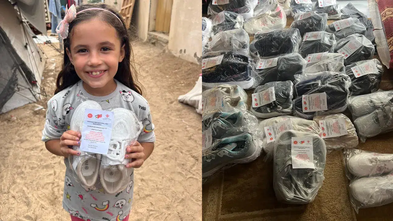 Adana’nın Saimbeyli ilçesinde kadınların emekleriyle hazırlanan yiyecek ve el sanatlarından elde edilen 84 bin TL sayesinde alınan ayakkabılar Gazzeli çocuklara ulaştırıldı.