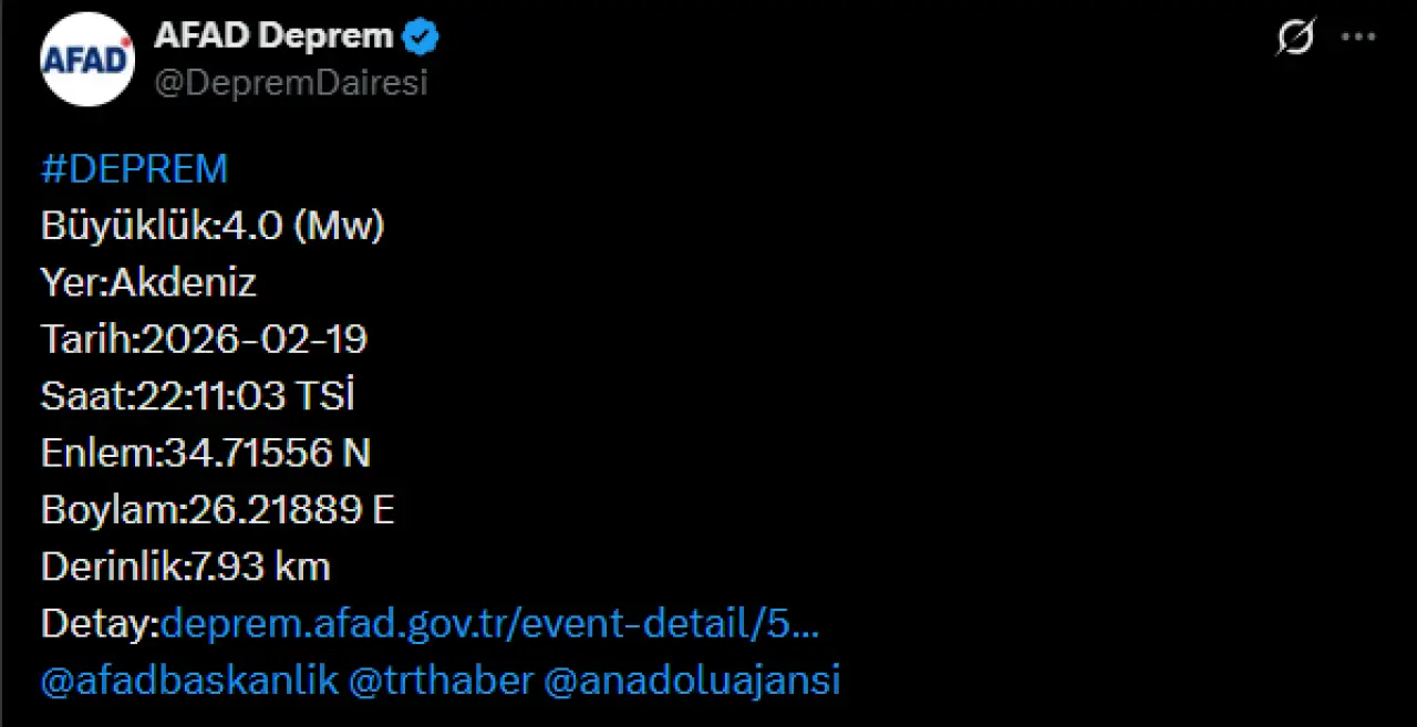 Afet ve Acil Durum Yönetimi Başkanlığı (AFAD) tarafından yapılan açıklamaya göre, saat 22.11 sıralarında Akdeniz'de 4.0 büyüklüğünde bir deprem meydana geldi.