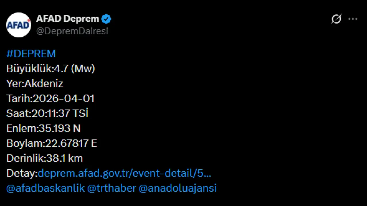 Afet ve Acil Durum Yönetimi Başkanlığı (AFAD) tarafından yapılan son paylaşıma göre, Akdeniz'de saat 20.11 sıralarında 4.7 büyüklüğünde bir deprem meydana geldi.