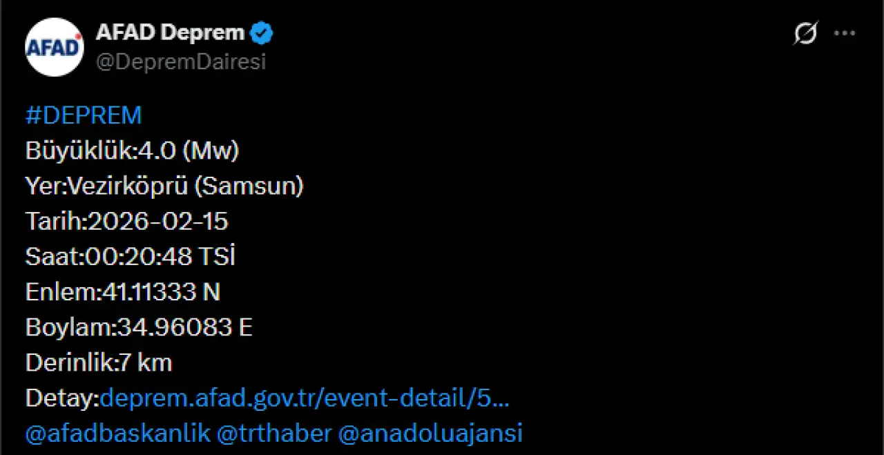 Afet ve Acil Durum Yönetimi Başkanlığı (AFAD) tarafından yapılan paylaşıma göre, saat 00.20 sıralarında Samsun Vezirköprü'de 4.0 büyüklüğünde deprem oldu.