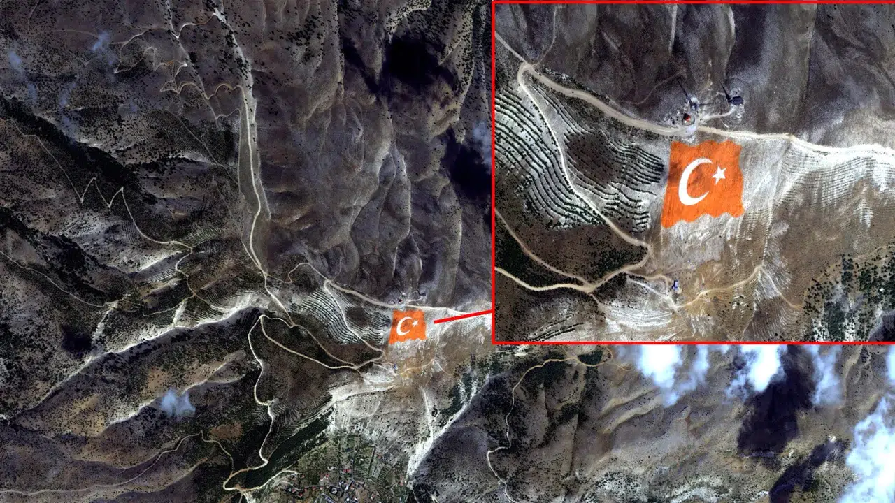 Kahramanmaraş'ın simgelerinden biri haline gelen Ahır Dağı zirvesine işlenen dev Ay Yıldızlı Türk Bayrağı, Cumhuriyet Bayramı dolayısıyla Göktürk-1 uydusu tarafından uzaydan görüntülendi.