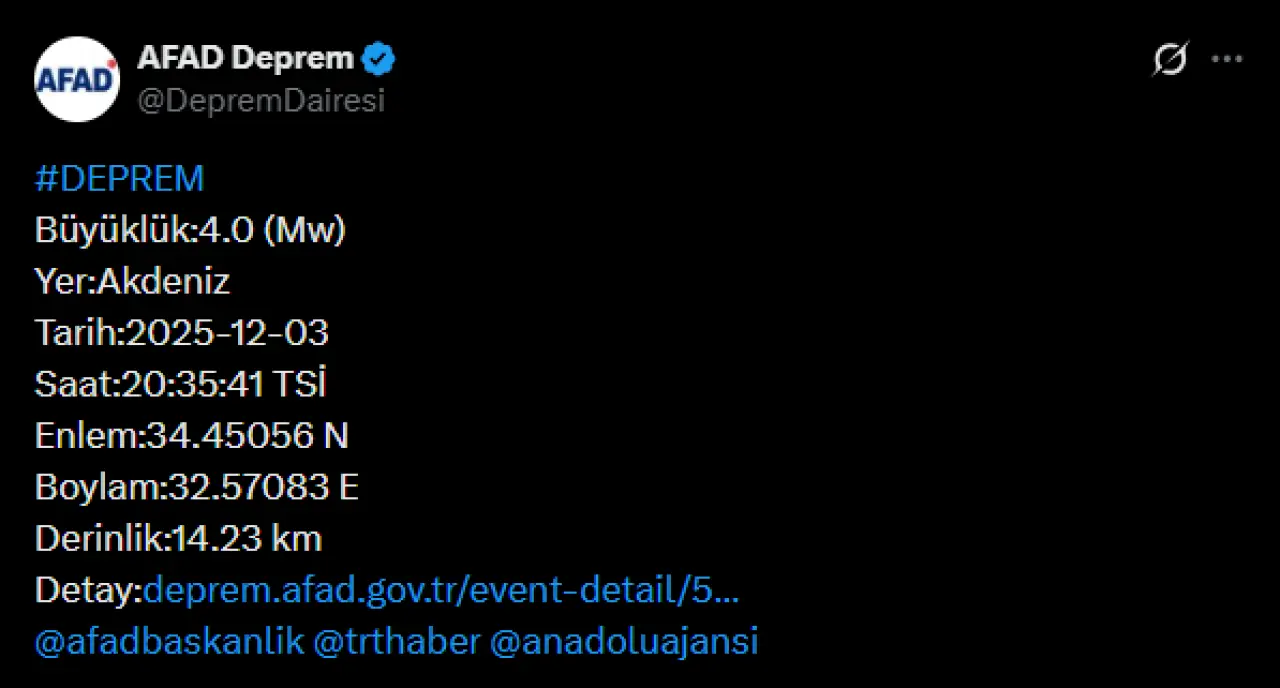 Afet ve Acil Durum Yönetim Başkanlığı (AFAD) tarafından yapılan son dakika açıklamasına göre, Akdeniz'de 20.35 sıralarında 4.0 büyüklüğünde bir deprem meydana geldi.