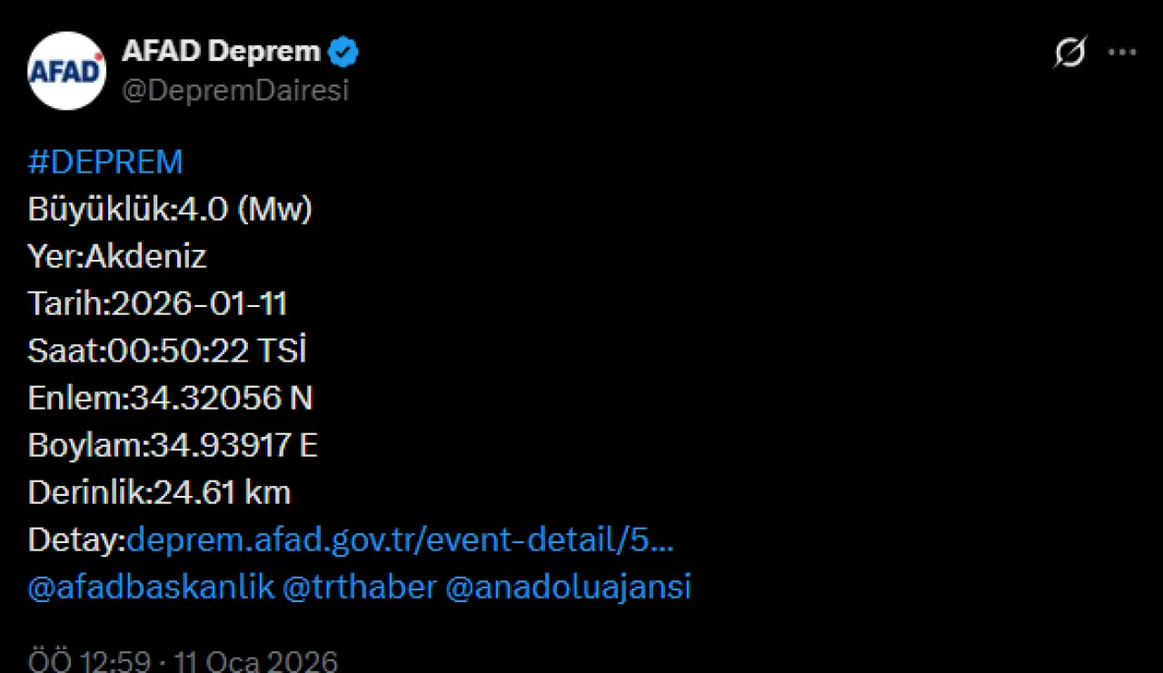 Afet ve Acil Durum Yönetimi Başkanlığı'nın (AFAD) sosyal medya hesabından yapılan paylaşıma göre, saat 00.50 sıralarında Akdeniz'de 4.0 büyüklüğünde bir deprem meydana geldi. Deprem, yerin 24.61 kilometre derinliğinde gerçekleşti.