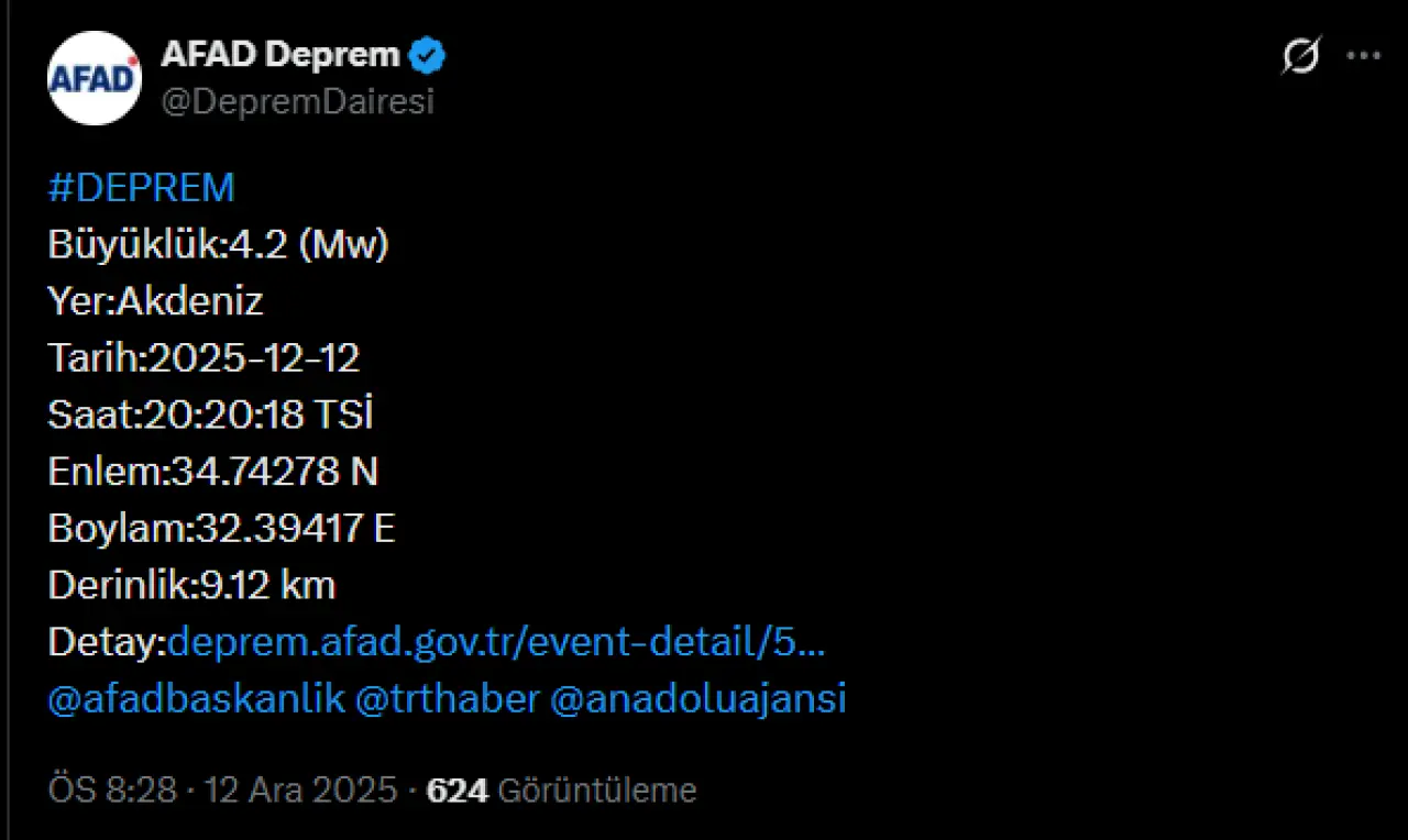Akdeniz’de saat 20.20 sıralarında 4.2 büyüklüğünde bir deprem meydana geldi. Sarsıntının yerin 9.12 kilometre derinliğinde gerçekleştiği bildirildi.