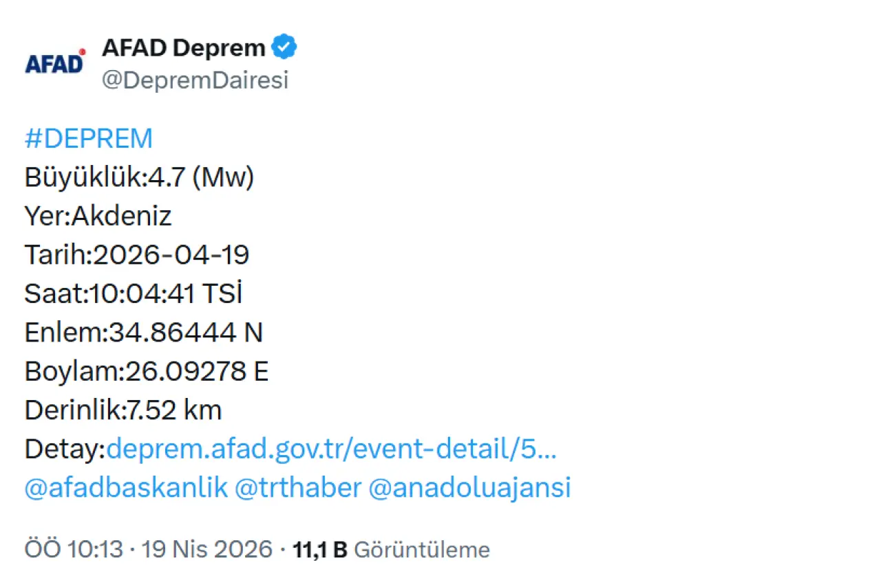 Afet ve Acil Durum Yönetimi Başkanlığı'ndan (AFAD) yapılan açıklamaya göre, Akdeniz açıklarında saat 10.04'te 4,7 büyüklüğünde bir deprem meydana geldi.