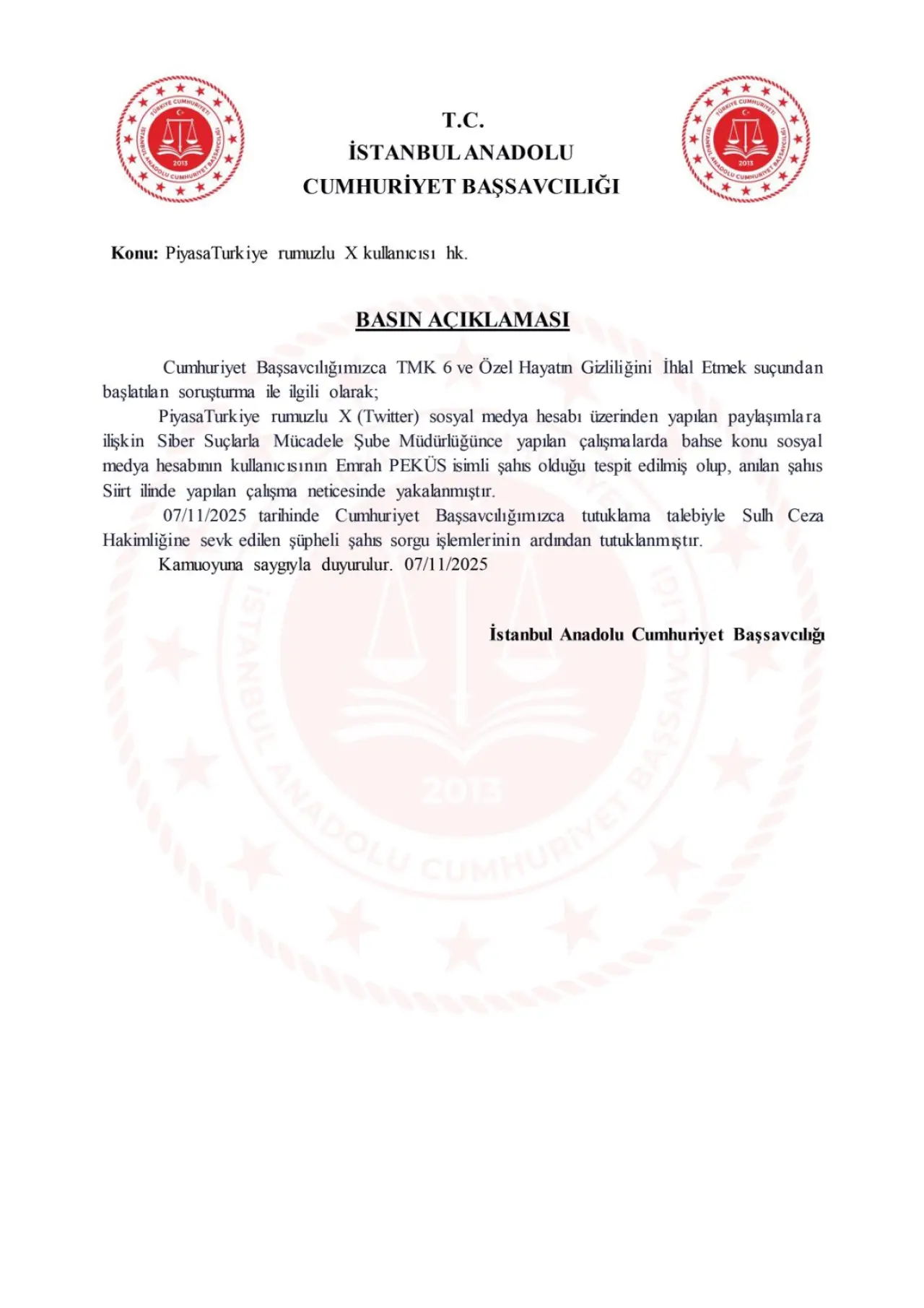 Cumhuriyet Başsavcılığımızca TMK 6 ve Özel Hayatı Gizliliğini ihlal Etmek suçundan başlatılan soruşturma ile ilgili olarak; PiyasaTurkiye rumuzlu X (Twitter) sosyal medya hesabı üzerinden yapılan paylaşımlara ilişkin Siber Suçlarla Mücadele Şube Müdürlüğünce yapılan çalışmalarda bahse konu sosyal medya hesabının kullanıcısının Emrah PEKÜS isimli şahıs olduğu tespit edilmiş olup, anılan şahıs Siirt ilinde yapılan çalışma neticesinde yakalanmıştır. 07/1 1/2025 tarihinde Cumhuriyet Başsavcılığımızca tutuklama talebiyle Hakimliğine sevk edilen şüpheli şahıs sorgu işlemlerinin ardından tutuklanmıştır.