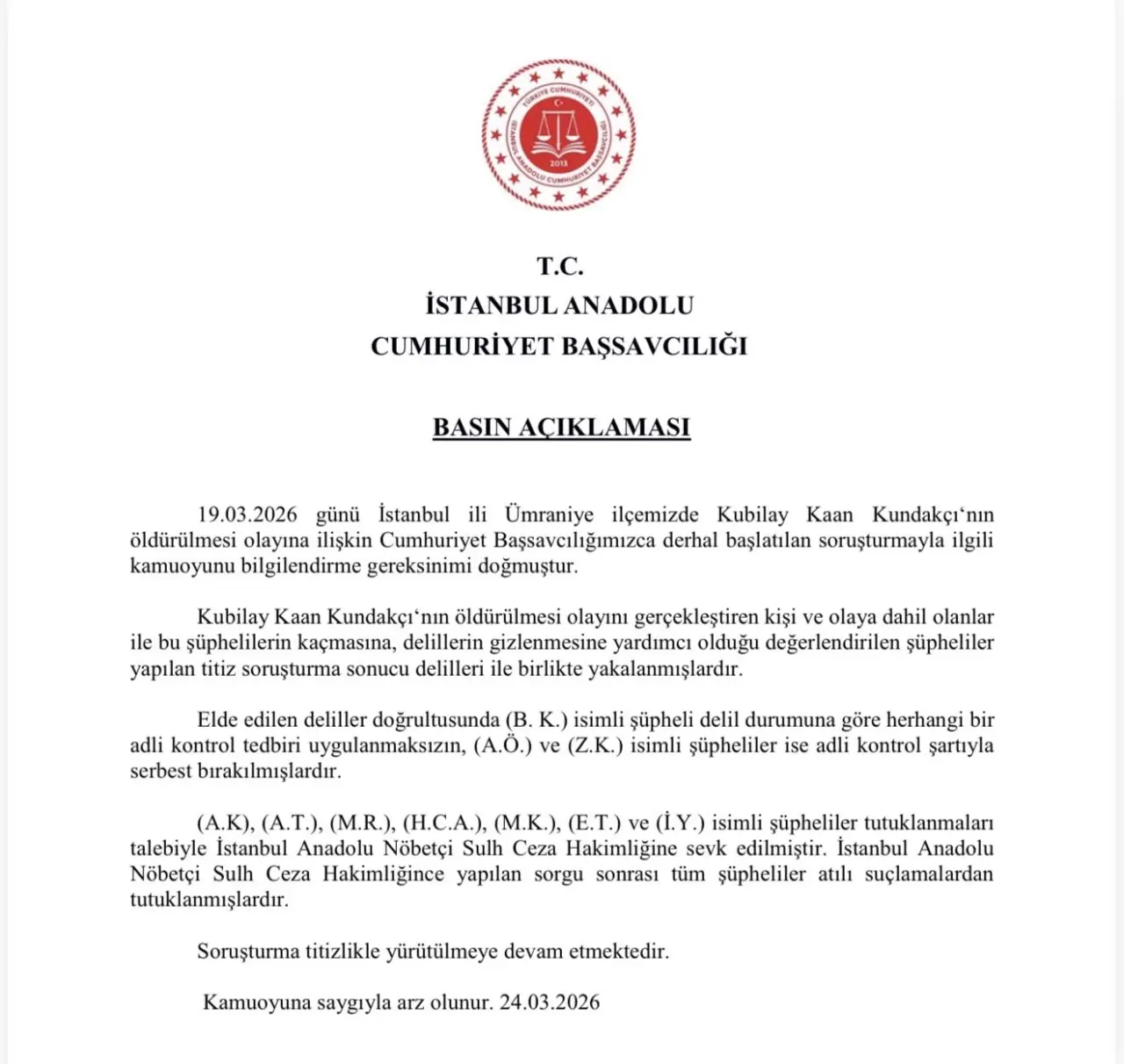 Şüphelilerden B.K., savcılık ifadesinin ardından herhangi bir adli kontrol tedbiri uygulanmaksızın serbest bırakıldı. Aleyna Kalaycıoğlu, Alaattin Kadayıfçıoğlu, İzzet Yıldızhan'ın da aralarında bulunduğu 7 şüpheli ise, tutuklama talebiyle nöbetçi sulh ceza hakimliğine sevk edildi.