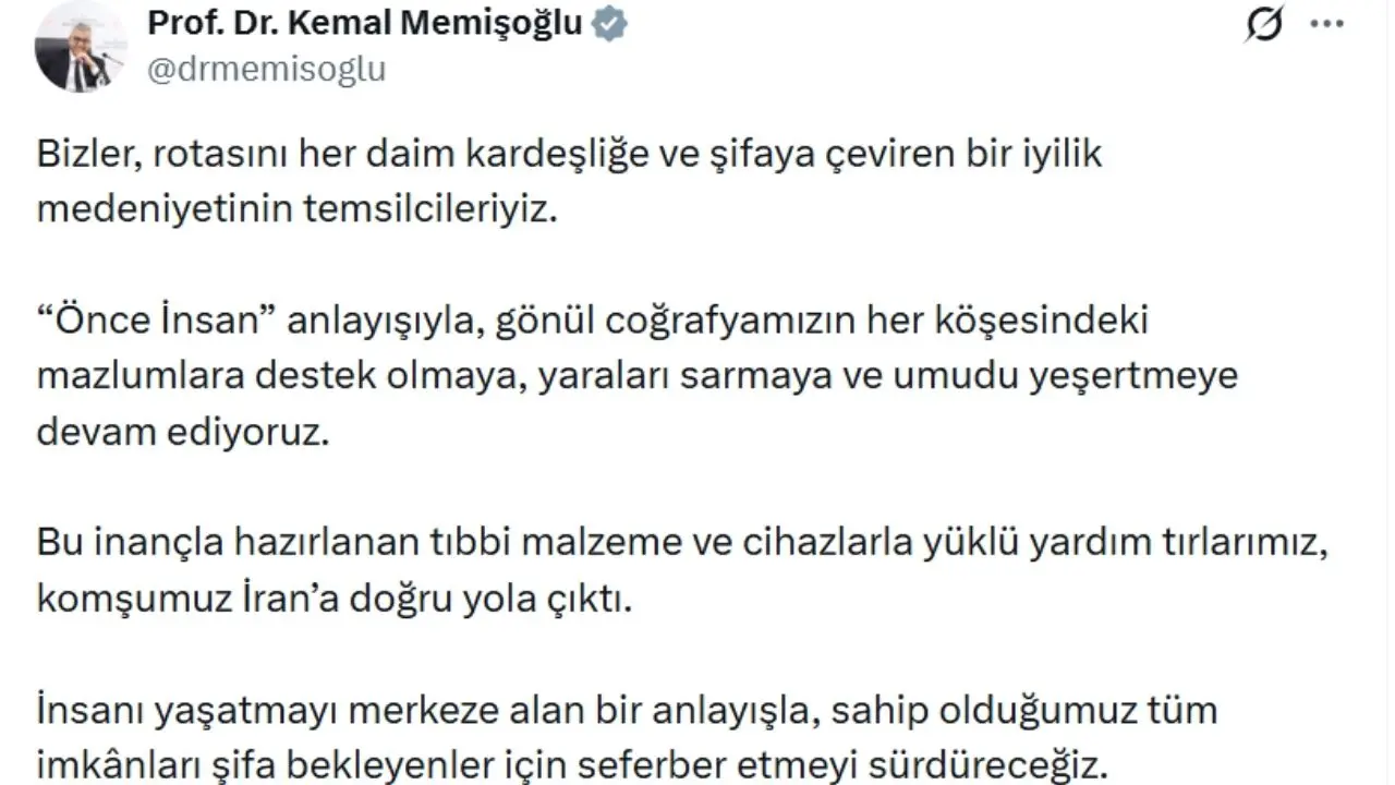 Sağlık Bakanı Kemal Memişoğlu, Türkiye’nin insani yardım vizyonu doğrultusunda hazırlanan tıbbi destek paketinin komşu ülke İran’a gönderildiğini açıkladı.