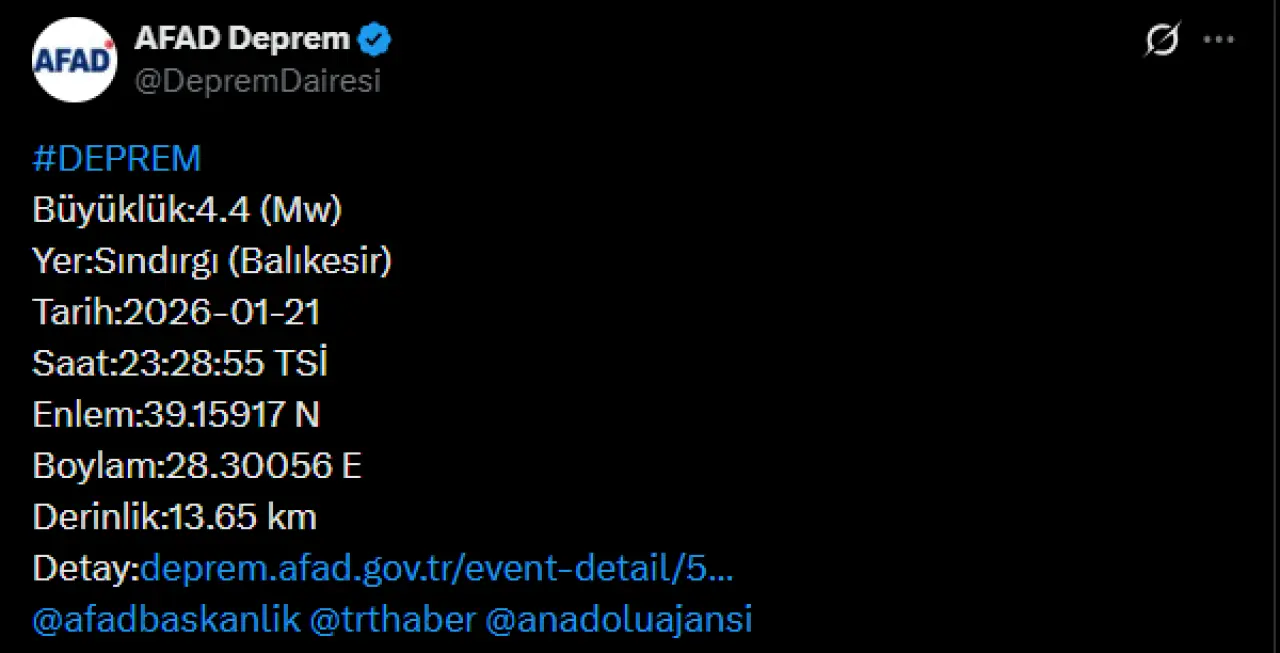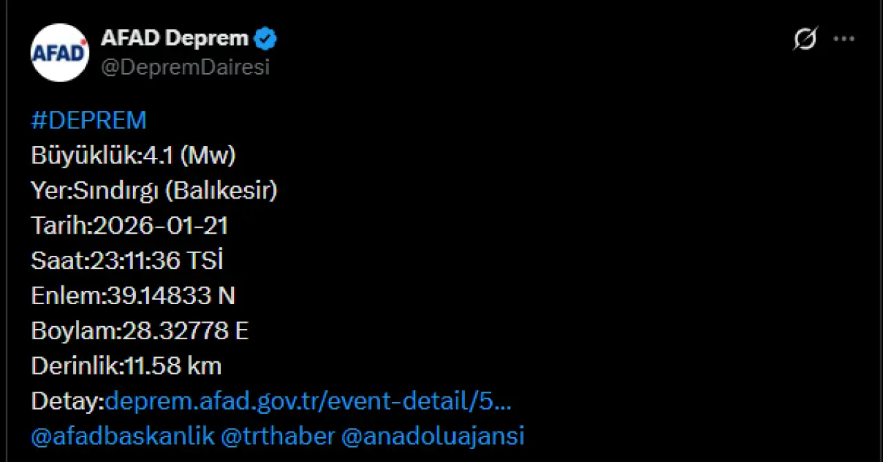 Afet ve Acil Durum Yönetimi Başkanlığı (AFAD) tarafından yayınlanan son paylaşıma göre, Balıkesir'in Sındırgı ilçesinde saat 23.11 sıralarında 4.1 büyüklüğünde deprem oldu. Depremin 11,58 kilometre derinlikte meydana geldiği belirlendi.