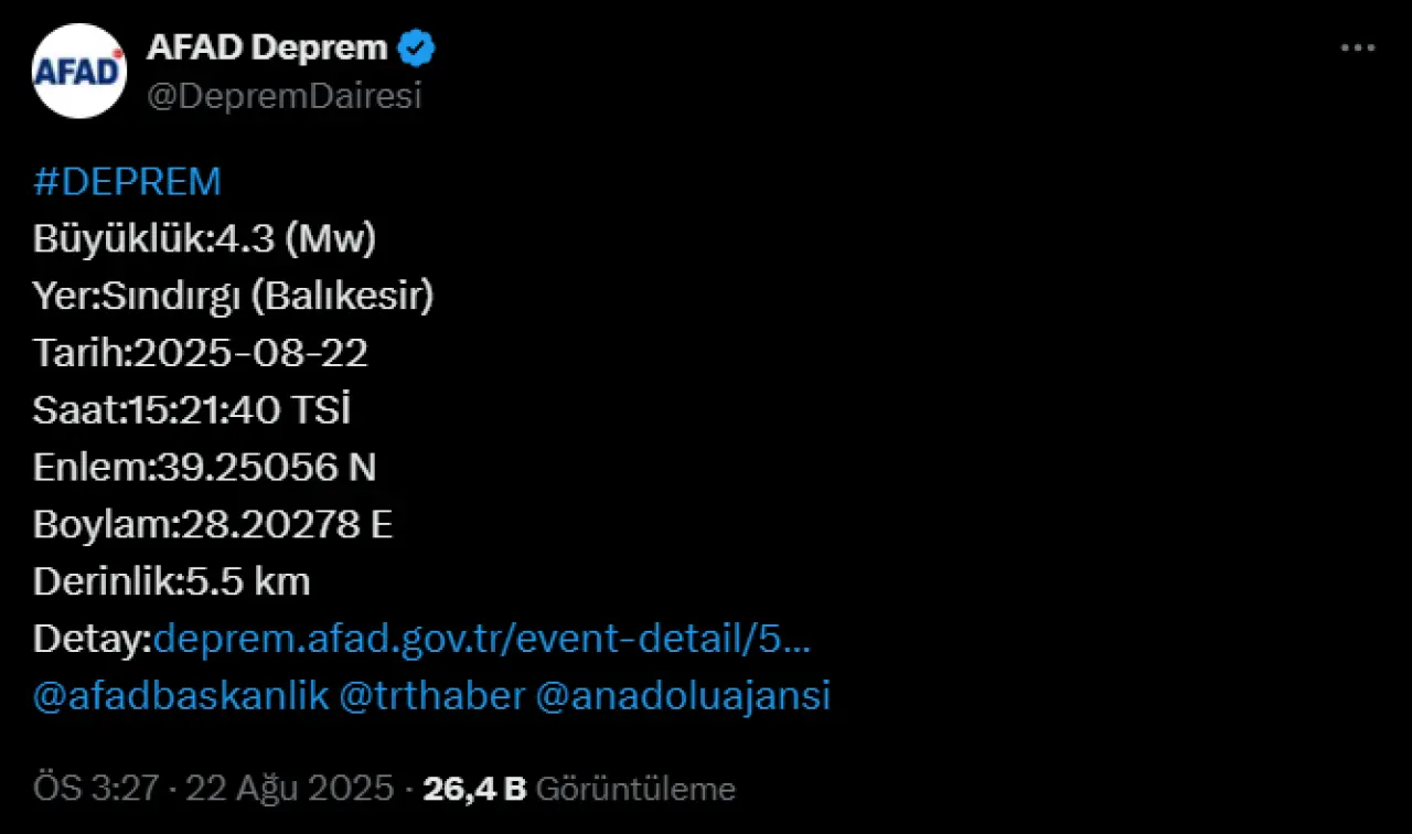 Afet ve Acil Durum Yönetimi Başkanlığı (AFAD) tarafından yapılan son açıklamaya göre, Balıkesir'in Sındırgı ilçesinde 4.3 büyüklüğünde bir deprem meydana geldi.