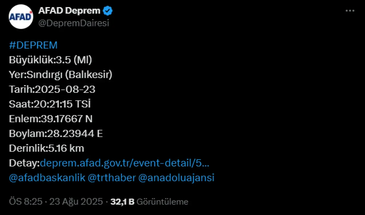 Afet ve Acil Durum Yönetimi Başkanlığı (AFAD) tarafından yapılan açıklamaya göre, Balıkesir'in Sındırgı ilçesinde saat 20.21'de 3.5 büyüklüğünde bir deprem meydana geldi.