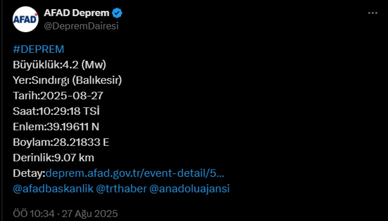Afet ve Acil Durum Yönetimi Başkanlığı (AFAD) tarafından yapılan son açıklamaya göre, Balıkesir'in Sındırgı ilçesinde saat 10.29 sıralarında 4,2 büyüklüğünde bir deprem meydana geldi. Deprem, 9.07 km derinlikte gerçekleşti.