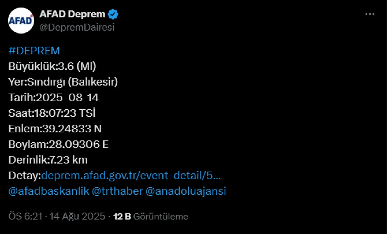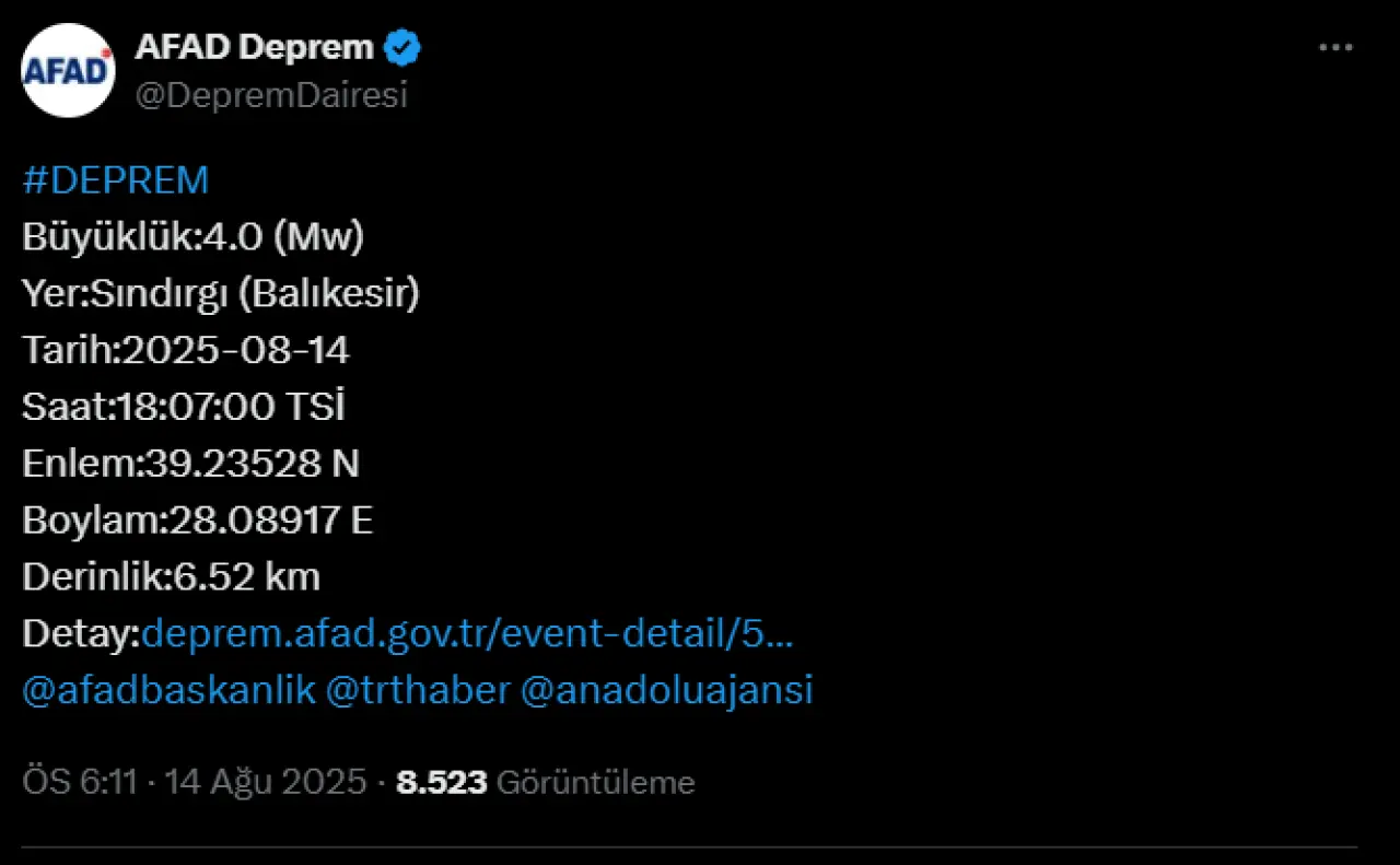 Afet ve Acil Durum Yönetimi Başkanlığı (AFAD) tarafından yapılan son açıklamaya göre, Balıkesir'in Sındırgı ilçesinde saat 18.07'de 4.0 büyüklüğünde bir deprem meydana geldi. 18.07 sıralarında gerçekleşen deprem 13.7 kilometre derinlikte oldu.