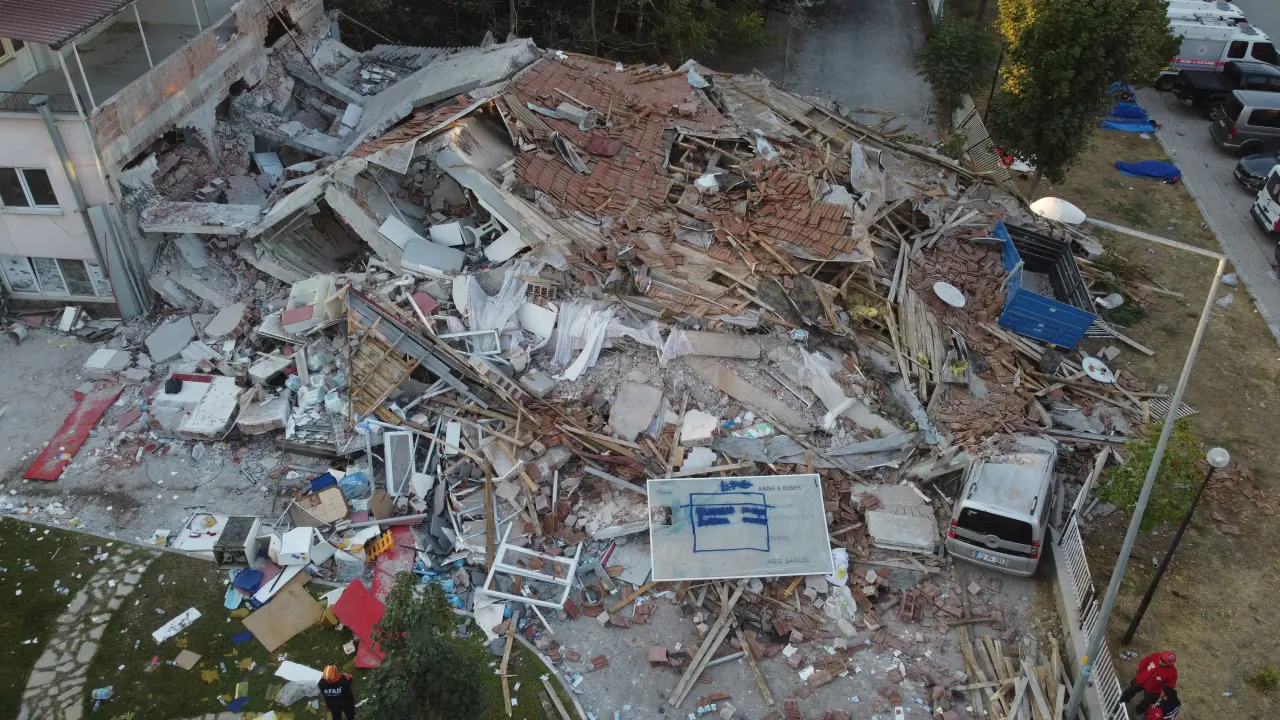 Balıkesir'in Sındırgı ilçesinde yaşanan 6.1 büyüklüğündeki deprem nedeniyle yıkılan bina sabahın ilk ışıklarıyla birlikte dron ile havadan görüntülendi.