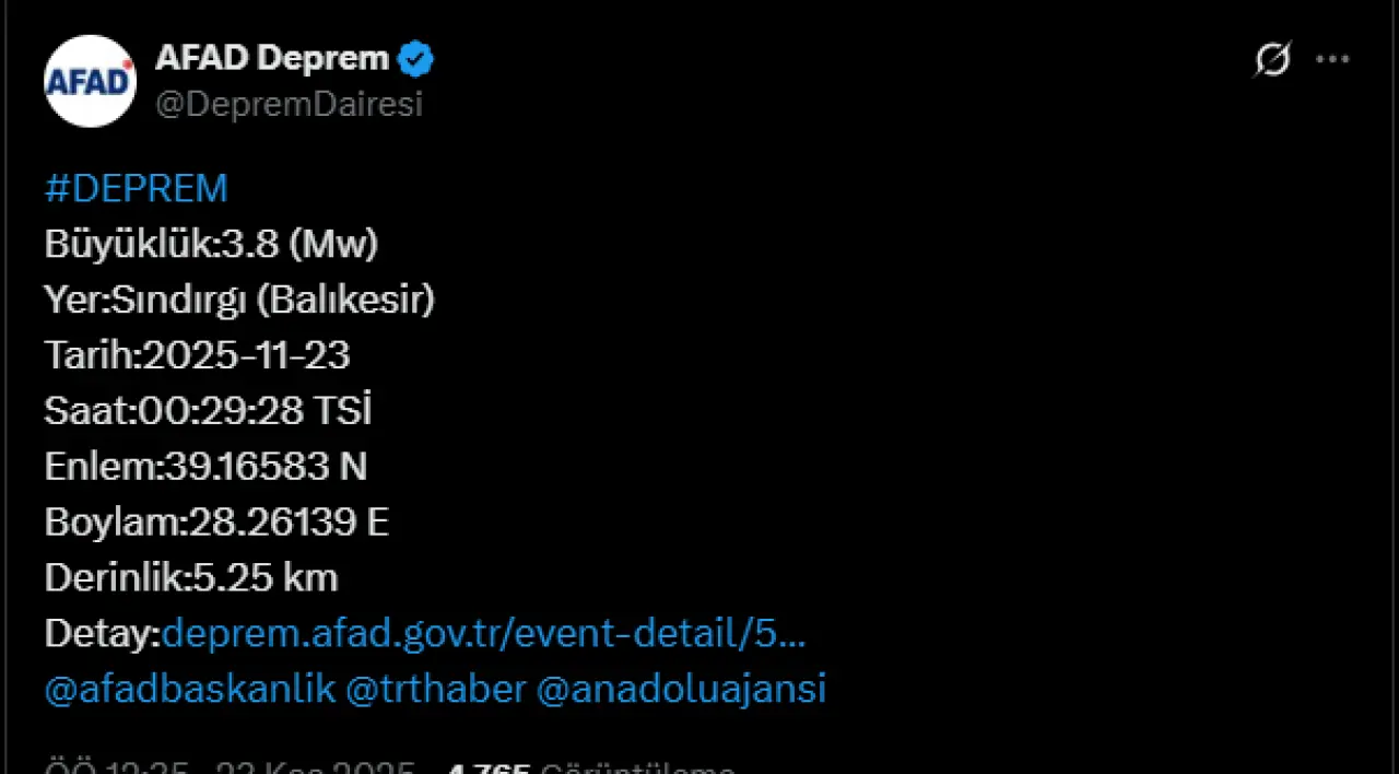 Afet ve Acil Durum Yönetimi Başkanlığı (AFAD) tarafından yapılan son açıklamaya göre, Balıkesir'in Sındırgı ilçesinde saat 00.29 sıralarında 3.8 büyüklüğünde bir deprem meydana geldi. Deprem, yerin 5.25 kilometre derinliğinde gerçekleşti.
