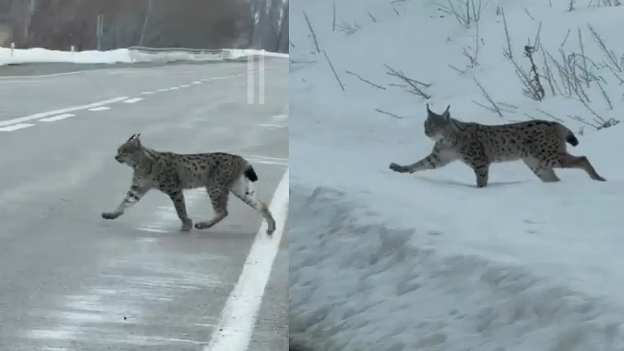 Bayburt’un Değirmencik köyünde nesli tükenme tehlikesi altında bulunan vaşak, karlı arazide görüntülendi. Bu nadir tür, yolun karşısına geçmeye çalışırken, o güzergahtan aracıyla ilerleyen Vedat Özeler’in dikkatini çekti.