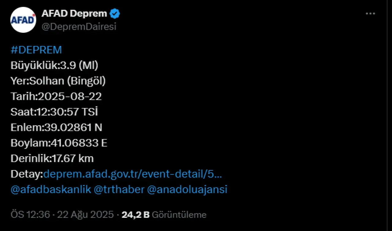 Afet ve Acil Durum Yönetimi Başkanlığı (AFAD) tarafından yapılan son açıklamaya göre, Bingöl'ün Solhan ilçesinde saat 12.30 sıralarında 3.9 büyüklüğünde bir deprem meydana geldi.