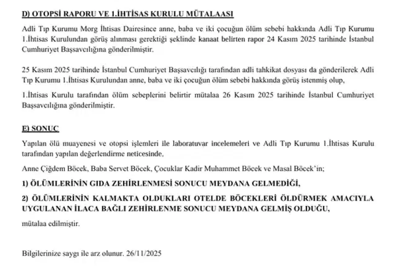 Yapılan ölü muayenesi ve otopsi işlemleri ile laboratuvar incelemeleri ve Adli Tıp Kurumu 1. İhtisas Kurulu tarafından yapılan değerlendirme neticesinde; Anne Çiğdem Böcek, baba Servet Böcek, çocuklar Kadir Muhammet Böcek ve Masal Böcek’in; Ölümlerinin gıda zehirlenmesi sonucu meydana gelmediği, Ölümlerinin, kalmakta oldukları otelde böcekleri öldürmek amacıyla uygulanan ilaca bağlı zehirlenme sonucu meydana gelmiş olduğu mütalaa edilmiştir''