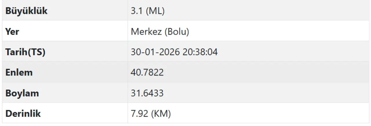 Afet ve Acil Durum Yönetimi Başkanlığı (AFAD) tarafından yapılan son açıklamaya göre, saat 20.38 sıralarında Bolu merkezde 3.1 büyüklüğünde bir deprem meydana geldi. Deprem, çevre illerde de hissedildi. AFAD, depremin 7.92 kilometre derinlikte yaşandığını bildirdi.
