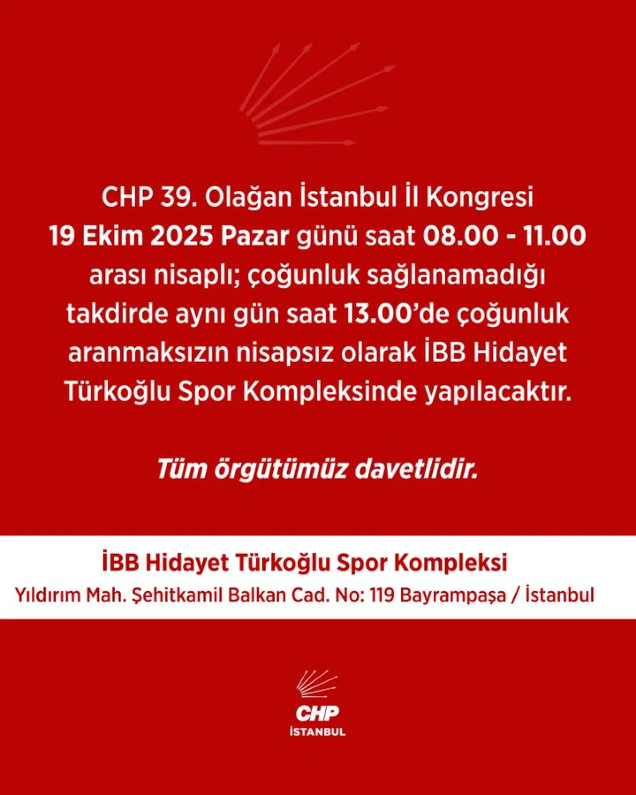 Cumhuriyet Halk Partisi (CHP) İstanbul İl Başkanlığı, 39. Olağan İl Kongresi’nin tarih ve yerini açıkladı. Kongre, 19 Ekim 2025 Pazar günü Bayrampaşa’da bulunan İBB Hidayet Türkoğlu Spor Kompleksi’nde toplanacak.