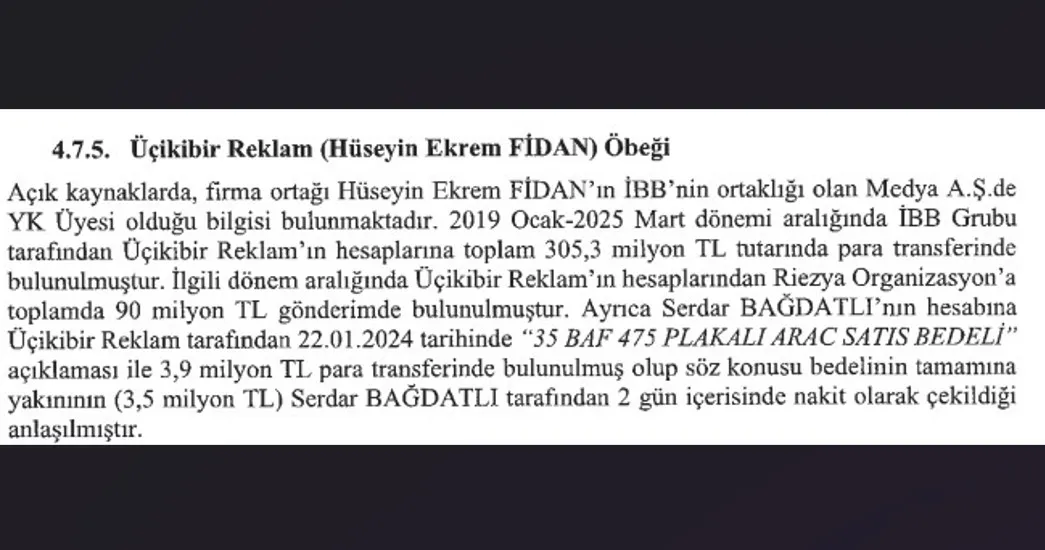 Rapora göre, İBB Medya A.Ş. Yönetim Kurulu Üyesi ve aynı zamanda Kültür A.Ş. çalışanı Hüseyin Ekrem Fidan’ın sahibi olduğu Üçikibir Reklam Şirketi’ne, 2019 yılından bu yana tam 305,3 milyon TL ödeme yapıldığı tespit edildi. Bu rakam, belediye bütçesinden özel bir şirkete aktarılan devasa bir kaynak olarak kayıtlara geçti.